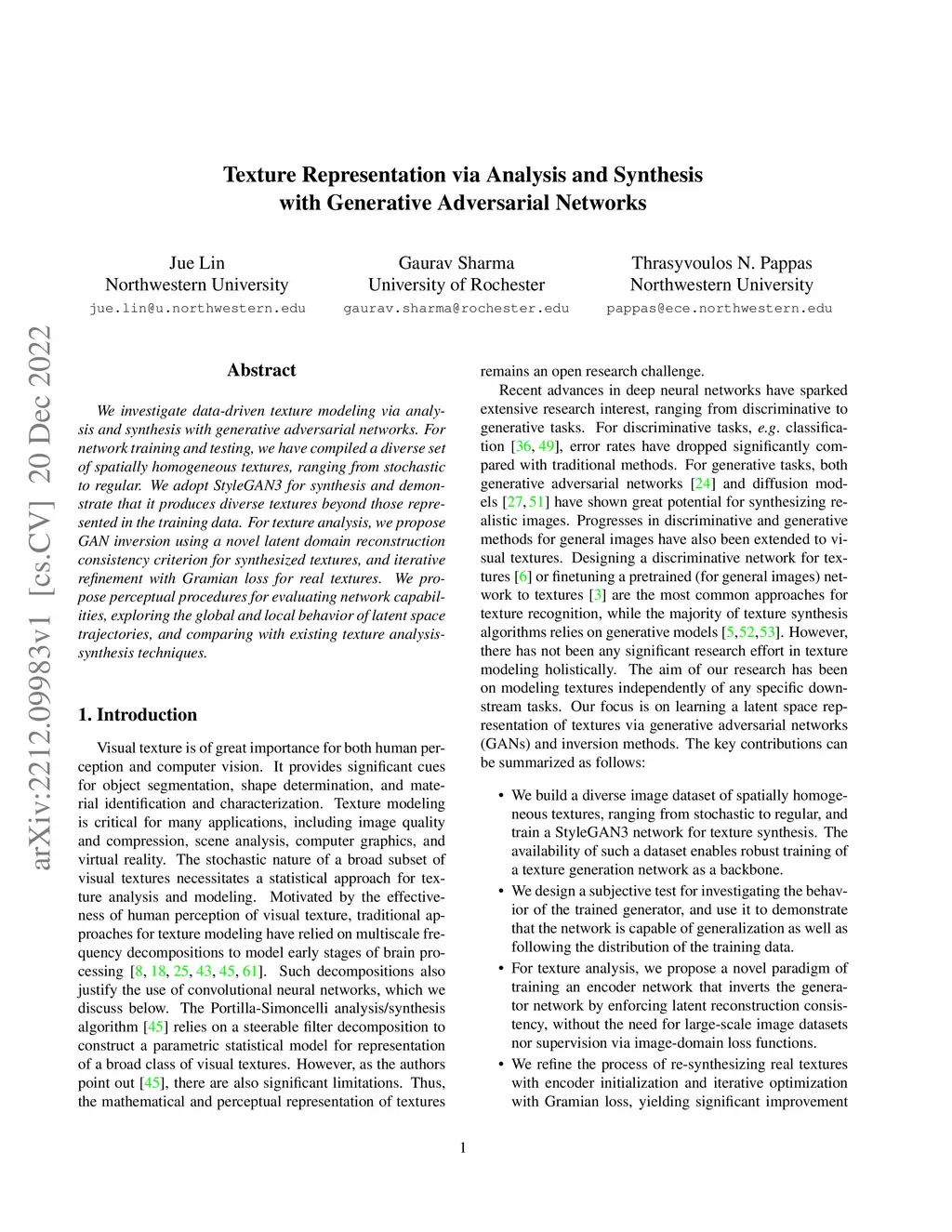 We investigate data-driven texture modeling via analysis and synthesis with generative adversarial networks. For network training and testing, we have compiled a diverse set of spatially homogeneous textures, ranging from stochastic to regular. We adopt StyleGAN3 for synthesis and demonstrate that it produces diverse textures beyond those represented in the training data. For texture analysis, we propose GAN inversion using a novel latent domain reconstruction consistency criterion for synthesized textures, and iterative refinement with Gramian loss for real textures. We propose perceptual procedures for evaluating network capabilities, exploring the global and local behavior of latent space trajectories, and comparing with existing texture analysis-synthesis techniques.