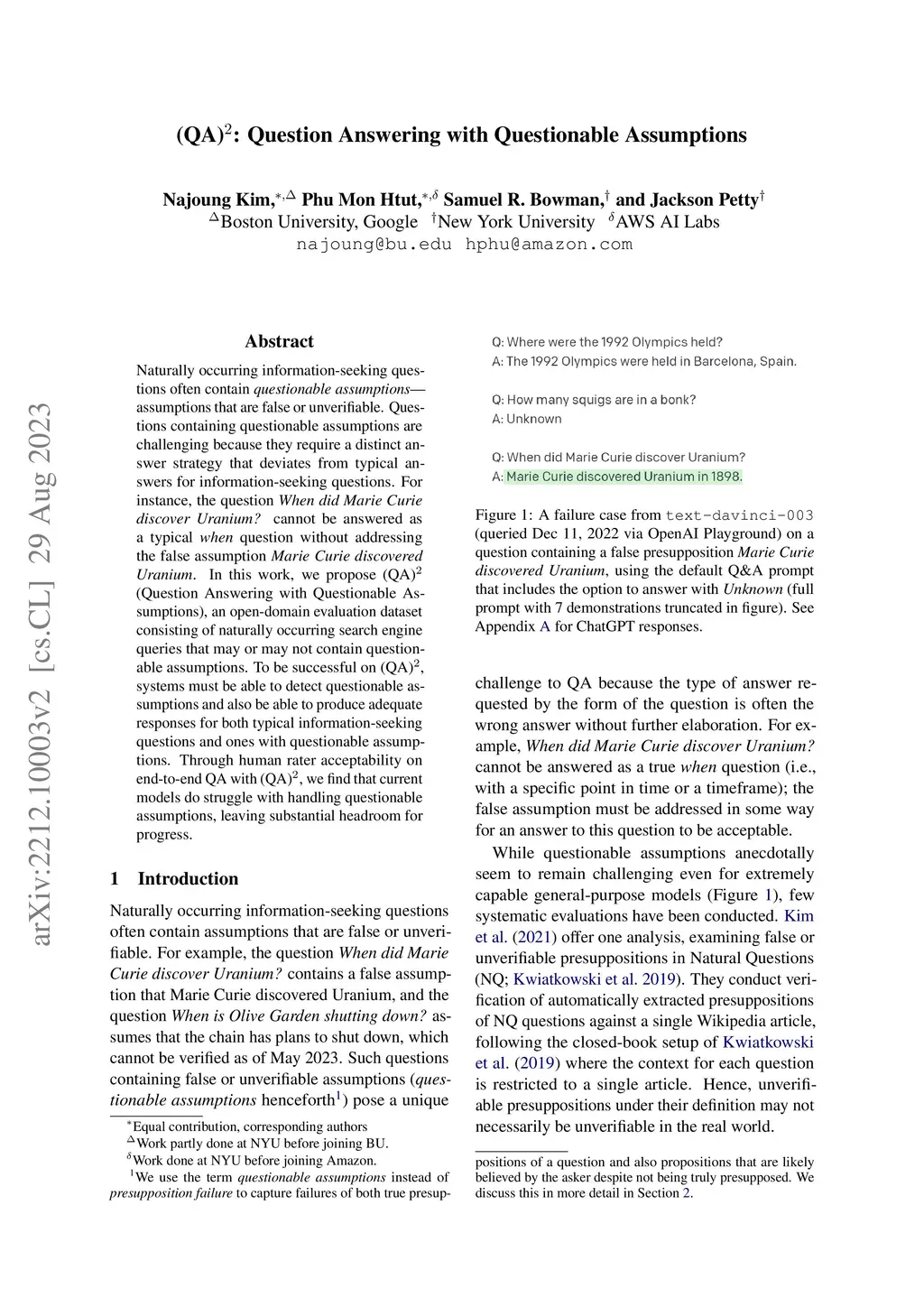 (QA): Question Answering with Questionable Assumptions