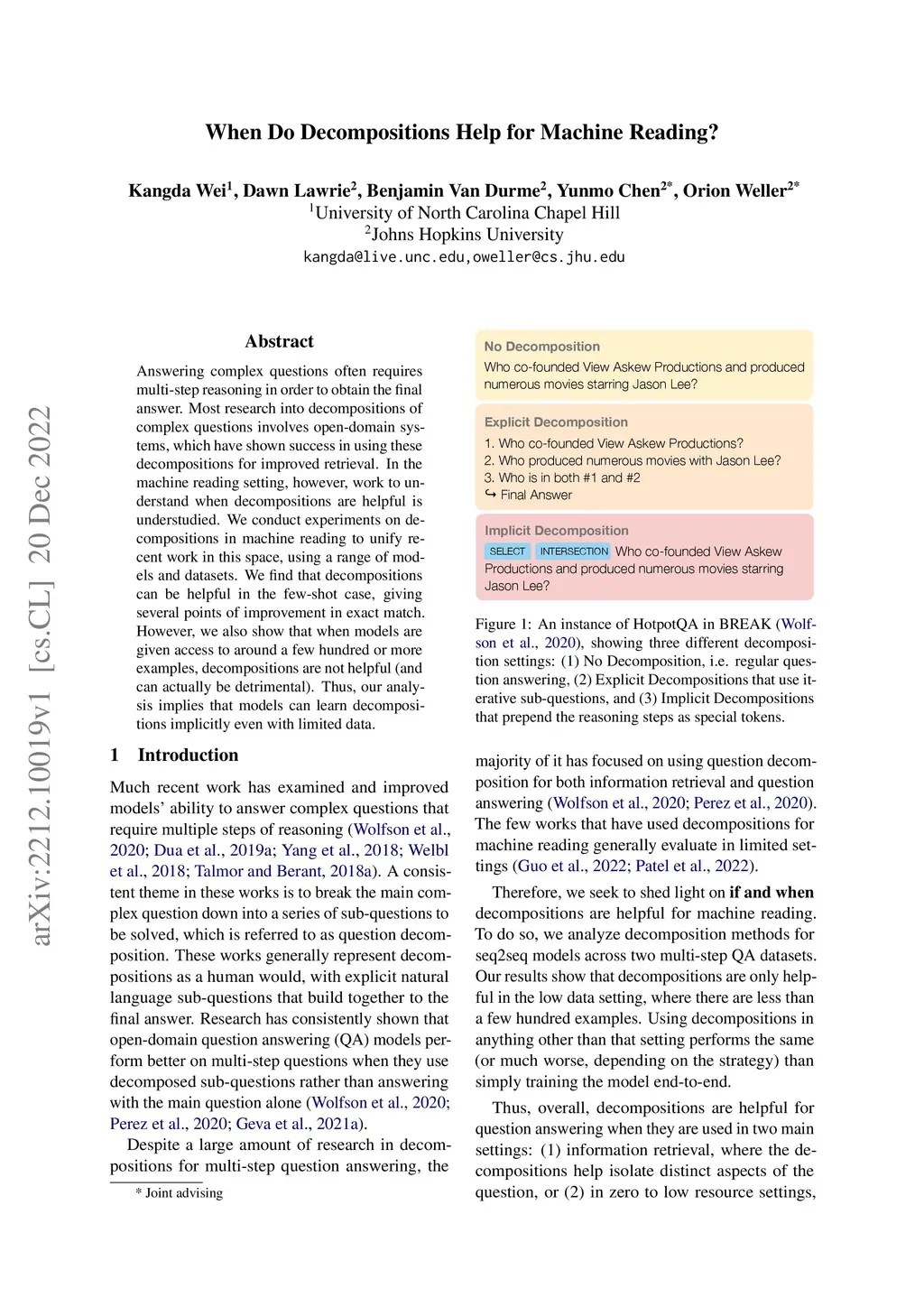 Answering complex questions often requires multi-step reasoning in order to obtain the final answer. Most research into decompositions of complex questions involves open-domain systems, which have shown success in using these decompositions for improved retrieval. In the machine reading setting, however, work to understand when decompositions are helpful is understudied. We conduct experiments on decompositions in machine reading to unify recent work in this space, using a range of models and datasets. We find that decompositions can be helpful in the few-shot case, giving several points of improvement in exact match scores. However, we also show that when models are given access to datasets with around a few hundred or more examples, decompositions are not helpful (and can actually be detrimental). Thus, our analysis implies that models can learn decompositions implicitly even with limited data.