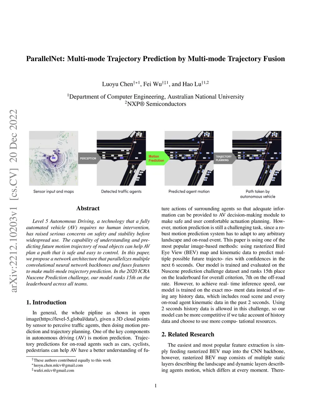 Level 5 Autonomous Driving, a technology that a fully automated vehicle (AV) requires no human intervention, has raised serious concerns on safety and stability before widespread use. The capability of understanding and predicting future motion trajectory of road objects can help AV plan a path that is safe and easy to control. In this paper, we propose a network architecture that parallelizes multiple convolutional neural network backbones and fuses features to make multi-mode trajectory prediction. In the 2020 ICRA Nuscene Prediction challenge, our model ranks 15th on the leaderboard across all teams.