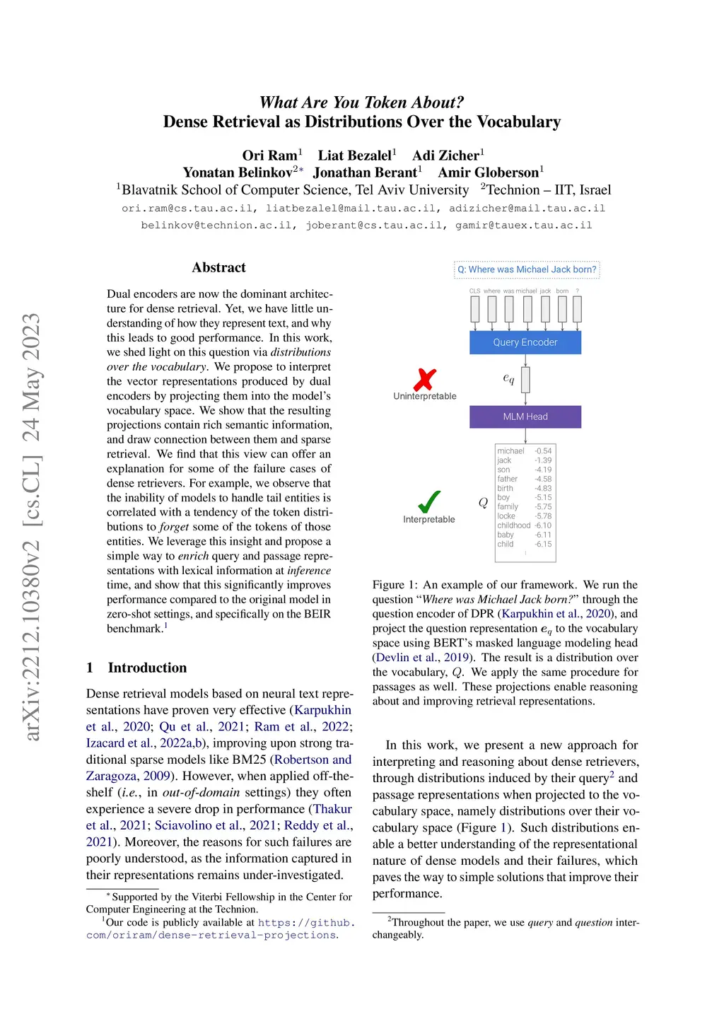 Dual encoders are now the dominant architecture for dense retrieval. Yet, we have little understanding of how they represent text, and why this leads to good performance. In this work, we shed light on this question via distributions over the vocabulary. We propose to interpret the vector representations produced by dual encoders by projecting them into the model's vocabulary space. We show that the resulting projections contain rich semantic information, and draw connection between them and sparse retrieval. We find that this view can offer an explanation for some of the failure cases of dense retrievers. For example, we observe that the inability of models to handle tail entities is correlated with a tendency of the token distributions to forget some of the tokens of those entities. We leverage this insight and propose a simple way to enrich query and passage representations with lexical information at inference time, and show that this significantly improves performance compared to the original model in zero-shot settings, and specifically on the BEIR benchmark.