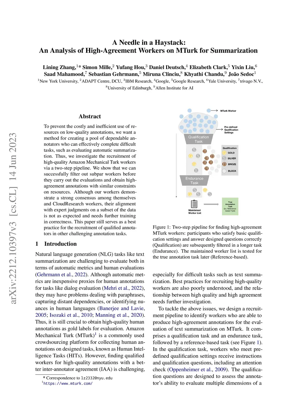 To prevent the costly and inefficient use of resources on low-quality annotations, we want a method for creating a pool of dependable annotators who can effectively complete difficult tasks, such as evaluating automatic summarization. Thus, we investigate the recruitment of high-quality Amazon Mechanical Turk workers via a two-step pipeline. We show that we can successfully filter out subpar workers before they carry out the evaluations and obtain high-agreement annotations with similar constraints on resources. Although our workers demonstrate a strong consensus among themselves and CloudResearch workers, their alignment with expert judgments on a subset of the data is not as expected and needs further training in correctness. This paper still serves as a best practice for the recruitment of qualified annotators in other challenging annotation tasks.