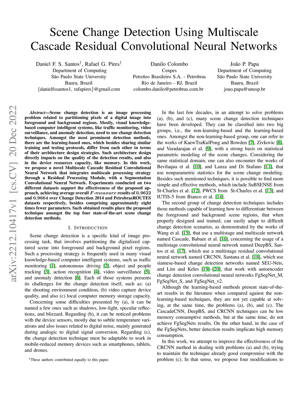 Scene change detection is an image processing problem related to partitioning pixels of a digital image into foreground and background regions. Mostly, visual knowledge-based computer intelligent systems, like traffic monitoring, video surveillance, and anomaly detection, need to use change detection techniques. Amongst the most prominent detection methods, there are the learning-based ones, which besides sharing similar training and testing protocols, differ from each other in terms of their architecture design strategies. Such architecture design directly impacts on the quality of the detection results, and also in the device resources capacity, like memory. In this work, we propose a novel Multiscale Cascade Residual Convolutional Neural Network that integrates multiscale processing strategy through a Residual Processing Module, with a Segmentation Convolutional Neural Network. Experiments conducted on two different datasets support the effectiveness of the proposed approach, achieving average overall results of and over Change Detection 2014 and PetrobrasROUTES datasets respectively, besides comprising approximately eight times fewer parameters. Such obtained results place the proposed technique amongst the top four state-of-the-art scene change detection methods.