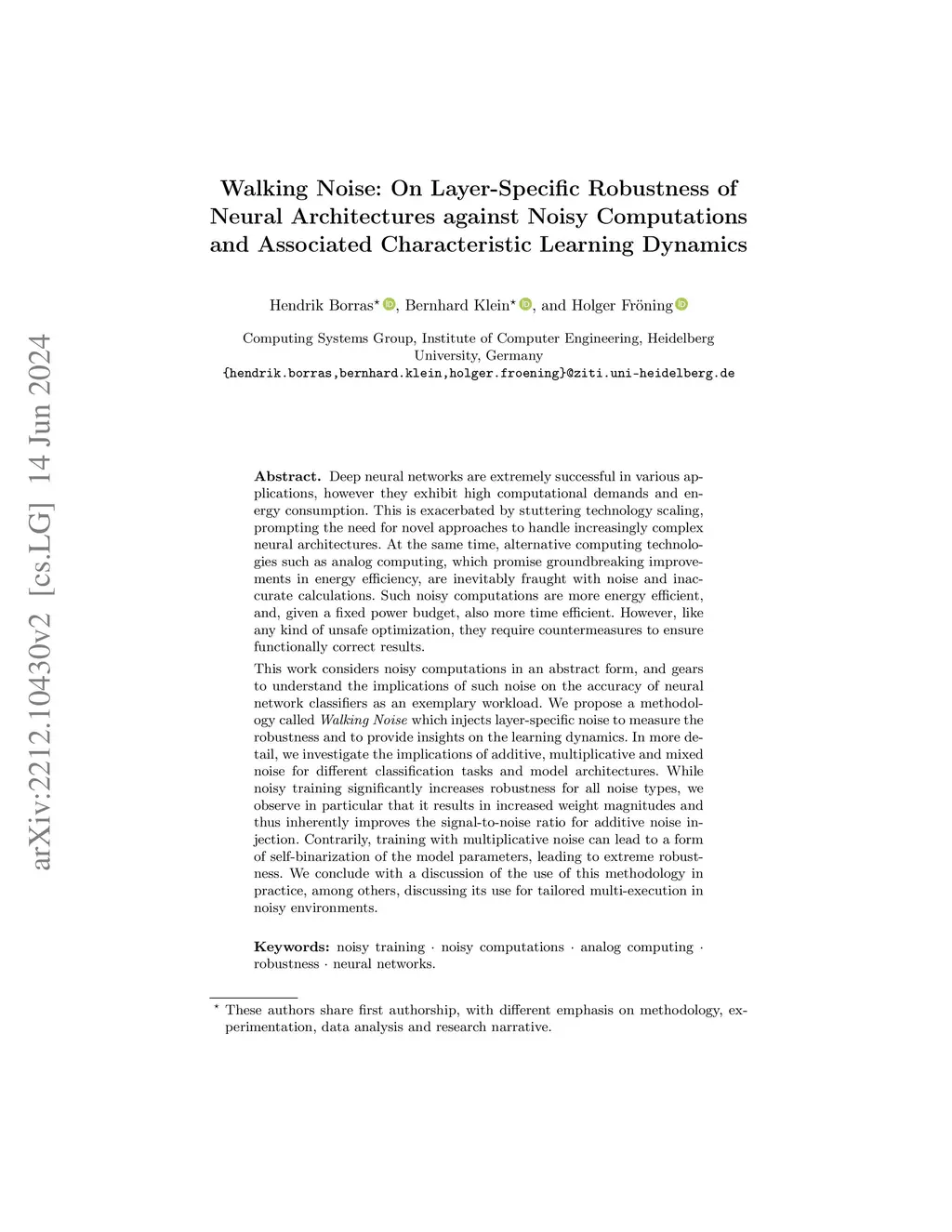 Deep neural networks are extremely successful in various applications, however they exhibit high computational demands and energy consumption. This is exacerbated by stuttering technology scaling, prompting the need for novel approaches to handle increasingly complex neural architectures. At the same time, alternative computing technologies such as analog computing, which promise groundbreaking improvements in energy efficiency, are inevitably fraught with noise and inaccurate calculations. Such noisy computations are more energy efficient, and, given a fixed power budget, also more time efficient. However, like any kind of unsafe optimization, they require countermeasures to ensure functionally correct results. This work considers noisy computations in an abstract form, and gears to understand the implications of such noise on the accuracy of neural network classifiers as an exemplary workload. We propose a methodology called Walking Noise which injects layer-specific noise to measure the robustness and to provide insights on the learning dynamics. In more detail, we investigate the implications of additive, multiplicative and mixed noise for different classification tasks and model architectures. While noisy training significantly increases robustness for all noise types, we observe in particular that it results in increased weight magnitudes and thus inherently improves the signal-to-noise ratio for additive noise injection. Contrarily, training with multiplicative noise can lead to a form of self-binarization of the model parameters, leading to extreme robustness. We conclude with a discussion of the use of this methodology in practice, among others, discussing its use for tailored multi-execution in noisy environments.