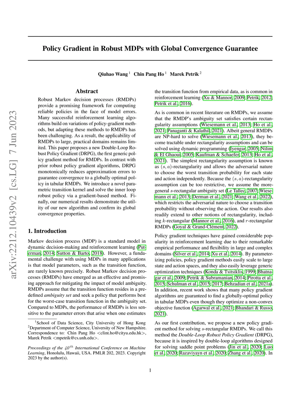 Robust Markov decision processes (RMDPs) provide a promising framework for computing reliable policies in the face of model errors. Many successful reinforcement learning algorithms build on variations of policy-gradient methods, but adapting these methods to RMDPs has been challenging. As a result, the applicability of RMDPs to large, practical domains remains limited. This paper proposes a new Double-Loop Robust Policy Gradient (DRPG), the first generic policy gradient method for RMDPs. In contrast with prior robust policy gradient algorithms, DRPG monotonically reduces approximation errors to guarantee convergence to a globally optimal policy in tabular RMDPs. We introduce a novel parametric transition kernel and solve the inner loop robust policy via a gradient-based method. Finally, our numerical results demonstrate the utility of our new algorithm and confirm its global convergence properties.