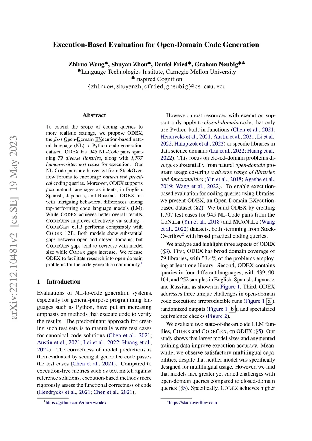 To extend the scope of coding queries to more realistic settings, we propose ODEX, the first Open-Domain EXecution-based natural language (NL) to Python code generation dataset. ODEX has 945 NL-Code pairs spanning 79 diverse libraries, along with 1,707 human-written test cases for execution. Our NL-Code pairs are harvested from StackOverflow forums to encourage natural and practical coding queries. Moreover, ODEX supports four natural languages as intents, in English, Spanish, Japanese, and Russian. ODEX unveils intriguing behavioral differences among top-performing code language models (LM). While CODEX achieves better overall results, CODEGEN improves effectively via scaling -- CODEGEN 6.1B performs comparably with CODEX 12B. Both models show substantial gaps between open and closed domains, but CODEGEN gaps tend to decrease with model size while CODEX gaps increase. We release ODEX to facilitate research into open-domain problems for the code generation community.
