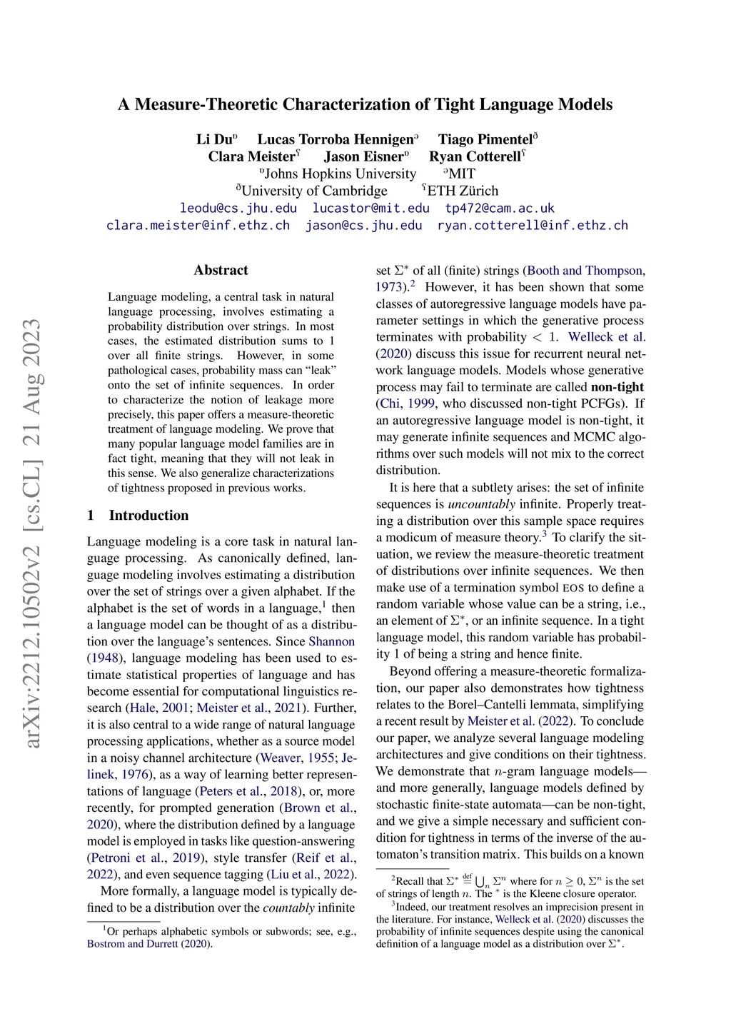 Language modeling, a central task in natural language processing, involves estimating a probability distribution over strings. In most cases, the estimated distribution sums to 1 over all finite strings. However, in some pathological cases, probability mass can ``leak'' onto the set of infinite sequences. In order to characterize the notion of leakage more precisely, this paper offers a measure-theoretic treatment of language modeling. We prove that many popular language model families are in fact tight, meaning that they will not leak in this sense. We also generalize characterizations of tightness proposed in previous works.