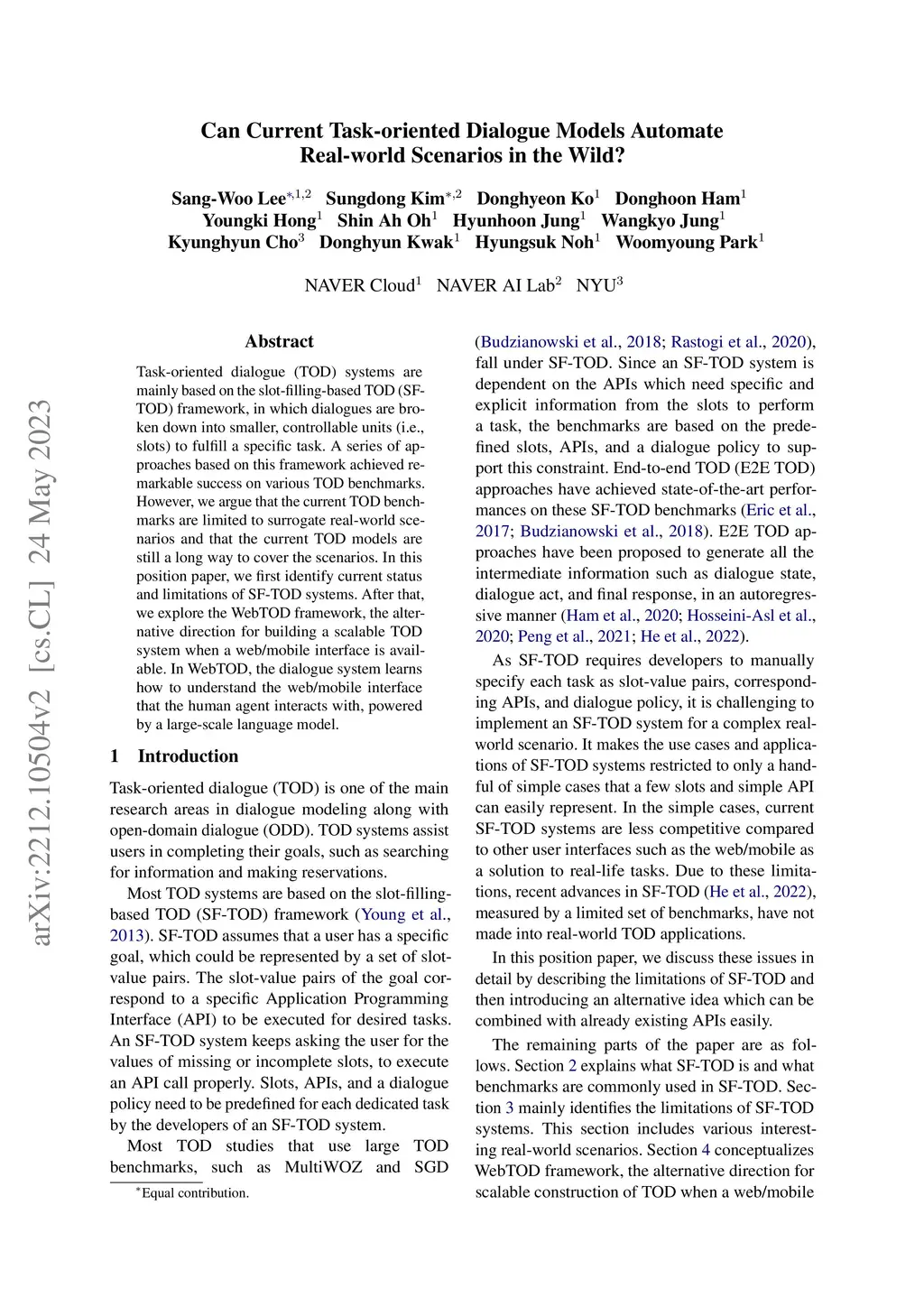 Task-oriented dialogue (TOD) systems are mainly based on the slot-filling-based TOD (SF-TOD) framework, in which dialogues are broken down into smaller, controllable units (i.e., slots) to fulfill a specific task. A series of approaches based on this framework achieved remarkable success on various TOD benchmarks. However, we argue that the current TOD benchmarks are limited to surrogate real-world scenarios and that the current TOD models are still a long way to cover the scenarios. In this position paper, we first identify current status and limitations of SF-TOD systems. After that, we explore the WebTOD framework, the alternative direction for building a scalable TOD system when a web/mobile interface is available. In WebTOD, the dialogue system learns how to understand the web/mobile interface that the human agent interacts with, powered by a large-scale language model.