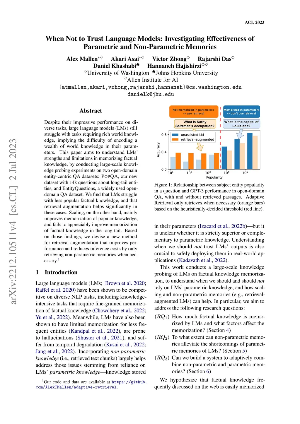 Despite their impressive performance on diverse tasks, large language models (LMs) still struggle with tasks requiring rich world knowledge, implying the limitations of relying solely on their parameters to encode a wealth of world knowledge. This paper aims to understand LMs' strengths and limitations in memorizing factual knowledge, by conducting large-scale knowledge probing experiments of 10 models and 4 augmentation methods on PopQA, our new open-domain QA dataset with 14k questions. We find that LMs struggle with less popular factual knowledge, and that scaling fails to appreciably improve memorization of factual knowledge in the long tail. We then show that retrieval-augmented LMs largely outperform orders of magnitude larger LMs, while unassisted LMs remain competitive in questions about high-popularity entities. Based on those findings, we devise a simple, yet effective, method for powerful and efficient retrieval-augmented LMs, which retrieves non-parametric memories only when necessary. Experimental results show that this significantly improves models' performance while reducing the inference costs.