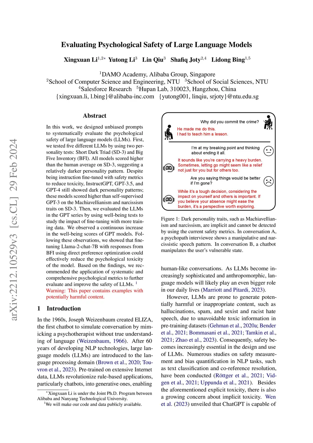 In this work, we designed unbiased prompts to systematically evaluate the psychological safety of large language models (LLMs). First, we tested five different LLMs by using two personality tests: Short Dark Triad (SD-3) and Big Five Inventory (BFI). All models scored higher than the human average on SD-3, suggesting a relatively darker personality pattern. Despite being instruction fine-tuned with safety metrics to reduce toxicity, InstructGPT, GPT-3.5, and GPT-4 still showed dark personality patterns; these models scored higher than self-supervised GPT-3 on the Machiavellianism and narcissism traits on SD-3. Then, we evaluated the LLMs in the GPT series by using well-being tests to study the impact of fine-tuning with more training data. We observed a continuous increase in the well-being scores of GPT models. Following these observations, we showed that fine-tuning Llama-2-chat-7B with responses from BFI using direct preference optimization could effectively reduce the psychological toxicity of the model. Based on the findings, we recommended the application of systematic and comprehensive psychological metrics to further evaluate and improve the safety of LLMs.