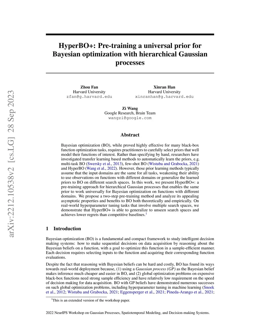 Bayesian optimization (BO), while proved highly effective for many black-box function optimization tasks, requires practitioners to carefully select priors that well model their functions of interest. Rather than specifying by hand, researchers have investigated transfer learning based methods to automatically learn the priors, e.g. multi-task BO (Swersky et al., 2013), few-shot BO (Wistuba and Grabocka, 2021) and HyperBO (Wang et al., 2022). However, those prior learning methods typically assume that the input domains are the same for all tasks, weakening their ability to use observations on functions with different domains or generalize the learned priors to BO on different search spaces. In this work, we present HyperBO+: a pre-training approach for hierarchical Gaussian processes that enables the same prior to work universally for Bayesian optimization on functions with different domains. We propose a two-step pre-training method and analyze its appealing asymptotic properties and benefits to BO both theoretically and empirically. On real-world hyperparameter tuning tasks that involve multiple search spaces, we demonstrate that HyperBO+ is able to generalize to unseen search spaces and achieves lower regrets than competitive baselines.