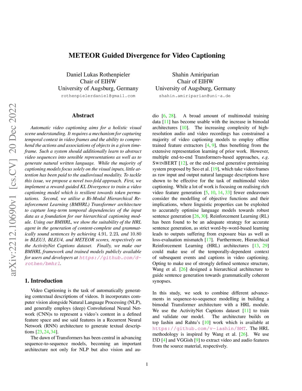 Automatic video captioning aims for a holistic visual scene understanding. It requires a mechanism for capturing temporal context in video frames and the ability to comprehend the actions and associations of objects in a given timeframe. Such a system should additionally learn to abstract video sequences into sensible representations as well as to generate natural written language. While the majority of captioning models focus solely on the visual inputs, little attention has been paid to the audiovisual modality. To tackle this issue, we propose a novel two-fold approach. First, we implement a reward-guided KL Divergence to train a video captioning model which is resilient towards token permutations. Second, we utilise a Bi-Modal Hierarchical Reinforcement Learning (BMHRL) Transformer architecture to capture long-term temporal dependencies of the input data as a foundation for our hierarchical captioning module. Using our BMHRL, we show the suitability of the HRL agent in the generation of content-complete and grammatically sound sentences by achieving , , and in BLEU3, BLEU4, and METEOR scores, respectively on the ActivityNet Captions dataset. Finally, we make our BMHRL framework and trained models publicly available for users and developers at https://github.com/d-rothen/bmhrl.