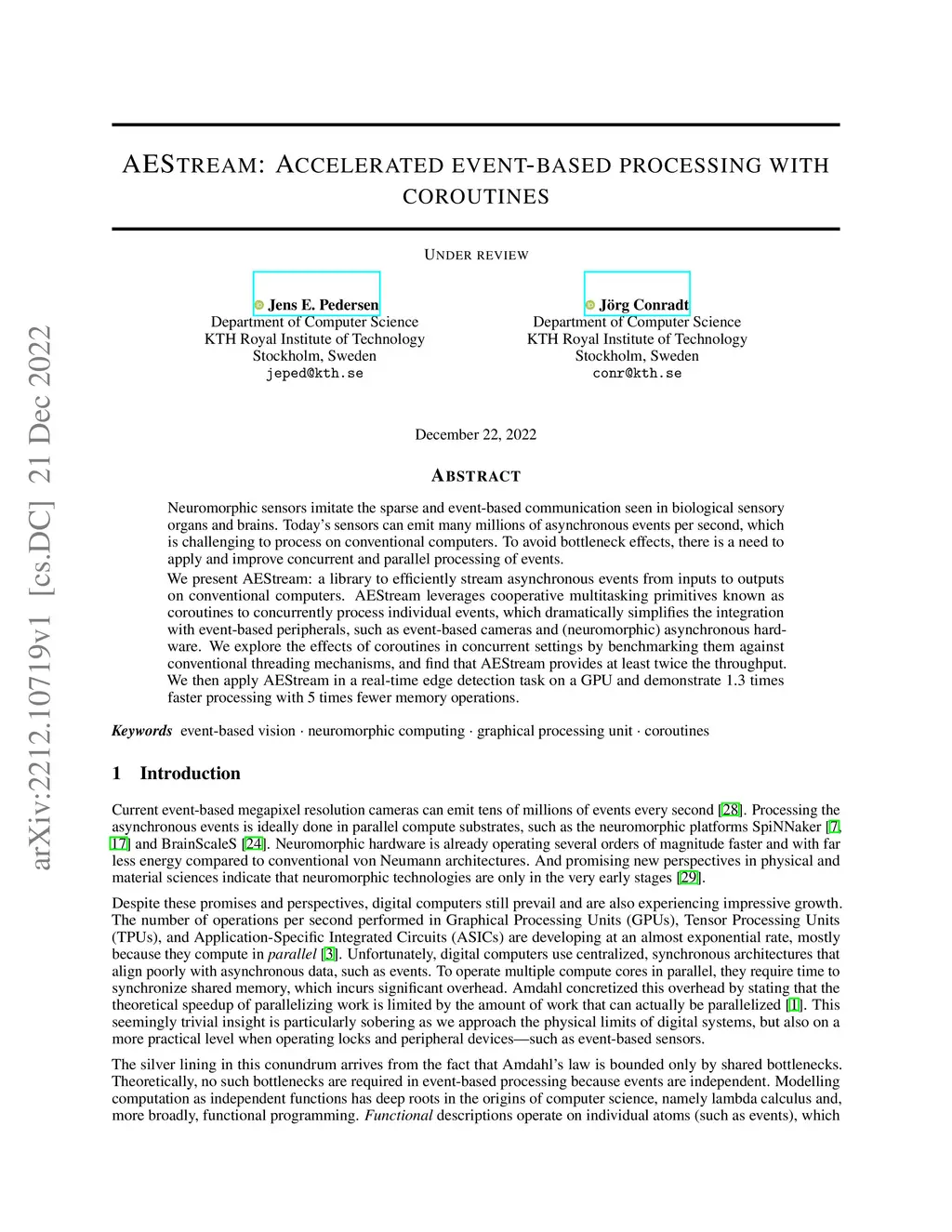 Neuromorphic sensors imitate the sparse and event-based communication seen in biological sensory organs and brains. Today's sensors can emit many millions of asynchronous events per second, which is challenging to process on conventional computers. To avoid bottleneck effects, there is a need to apply and improve concurrent and parallel processing of events. We present AEStream: a library to efficiently stream asynchronous events from inputs to outputs on conventional computers. AEStream leverages cooperative multitasking primitives known as coroutines to concurrently process individual events, which dramatically simplifies the integration with event-based peripherals, such as event-based cameras and (neuromorphic) asynchronous hardware. We explore the effects of coroutines in concurrent settings by benchmarking them against conventional threading mechanisms, and find that AEStream provides at least twice the throughput. We then apply AEStream in a real-time edge detection task on a GPU and demonstrate 1.3 times faster processing with 5 times fewer memory operations.