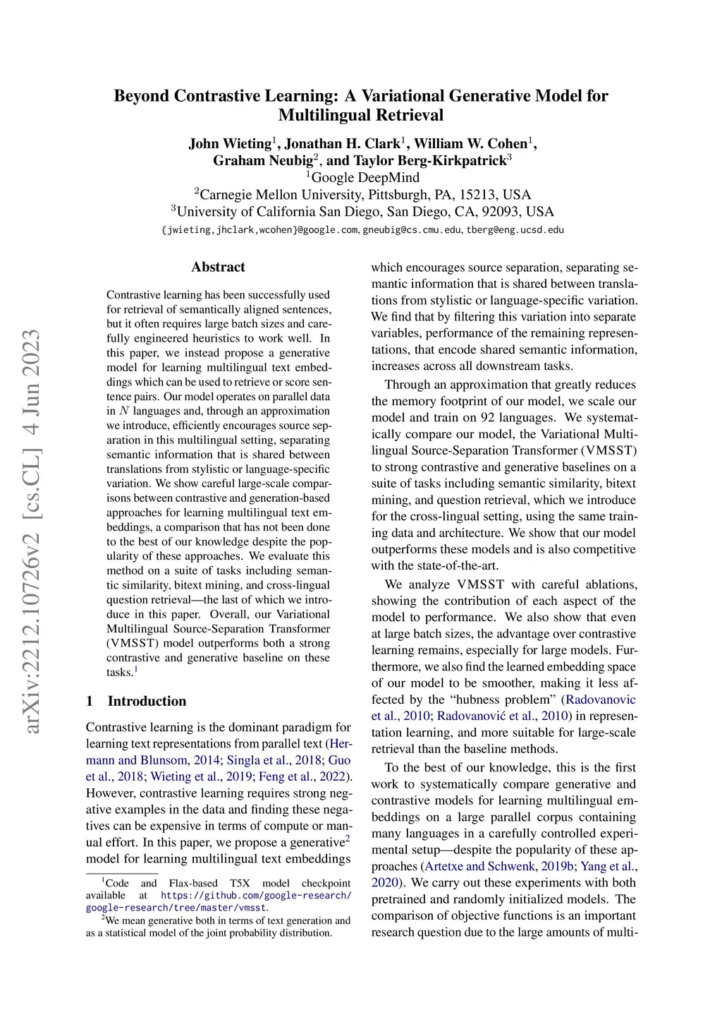 Contrastive learning has been successfully used for retrieval of semantically aligned sentences, but it often requires large batch sizes or careful engineering to work well. In this paper, we instead propose a generative model for learning multilingual text embeddings which can be used to retrieve or score sentence pairs. Our model operates on parallel data in languages and, through an approximation we introduce, efficiently encourages source separation in this multilingual setting, separating semantic information that is shared between translations from stylistic or language-specific variation. We show careful large-scale comparisons between contrastive and generation-based approaches for learning multilingual text embeddings, a comparison that has not been done to the best of our knowledge despite the popularity of these approaches. We evaluate this method on a suite of tasks including semantic similarity, bitext mining, and cross-lingual question retrieval -- the last of which we introduce in this paper. Overall, our Variational Multilingual Source-Separation Transformer (VMSST) model outperforms both a strong contrastive and generative baseline on these tasks.