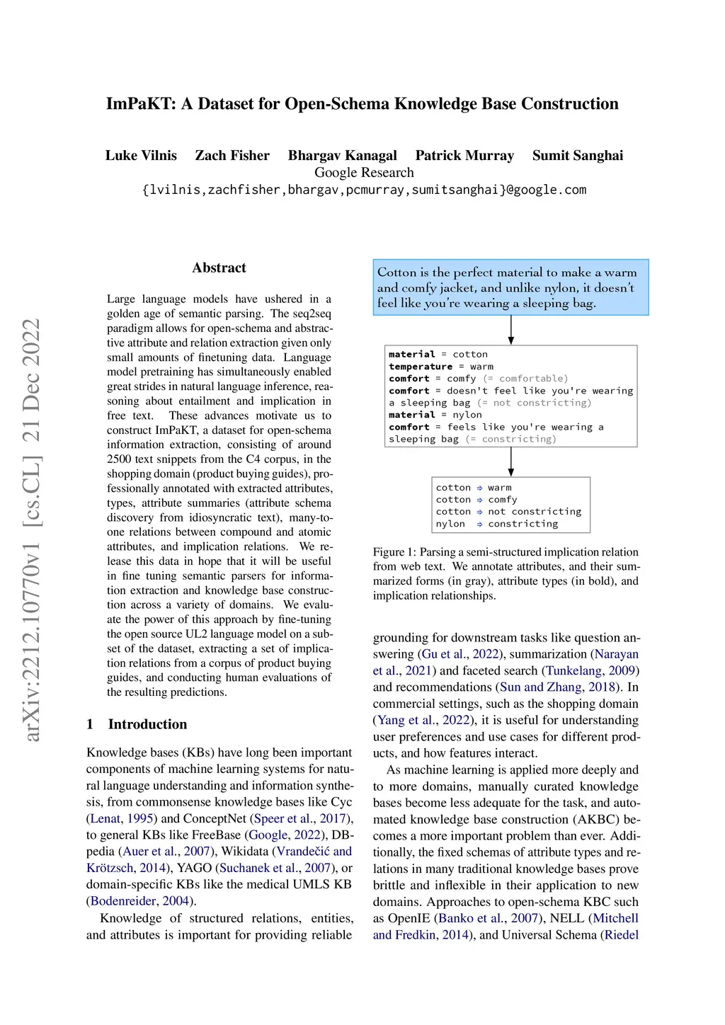 Large language models have ushered in a golden age of semantic parsing. The seq2seq paradigm allows for open-schema and abstractive attribute and relation extraction given only small amounts of finetuning data. Language model pretraining has simultaneously enabled great strides in natural language inference, reasoning about entailment and implication in free text. These advances motivate us to construct ImPaKT, a dataset for open-schema information extraction, consisting of around 2500 text snippets from the C4 corpus, in the shopping domain (product buying guides), professionally annotated with extracted attributes, types, attribute summaries (attribute schema discovery from idiosyncratic text), many-to-one relations between compound and atomic attributes, and implication relations. We release this data in hope that it will be useful in fine tuning semantic parsers for information extraction and knowledge base construction across a variety of domains. We evaluate the power of this approach by fine-tuning the open source UL2 language model on a subset of the dataset, extracting a set of implication relations from a corpus of product buying guides, and conducting human evaluations of the resulting predictions.
