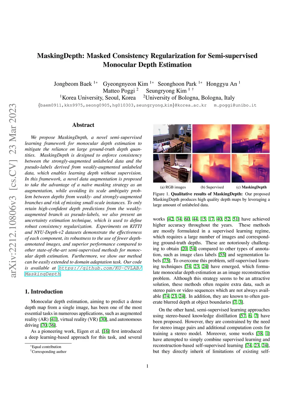 Semi-Supervised Learning (SSL) has recently accomplished successful achievements in various fields such as image classification, object detection, and semantic segmentation, which typically require a lot of labour to construct ground-truth. Especially in the depth estimation task, annotating training data is very costly and time-consuming, and thus recent SSL regime seems an attractive solution. In this paper, for the first time, we introduce a novel framework for semi-supervised learning of monocular depth estimation networks, using consistency regularization to mitigate the reliance on large ground-truth depth data. We propose a novel data augmentation approach, called K-way disjoint masking, which allows the network for learning how to reconstruct invisible regions so that the model not only becomes robust to perturbations but also generates globally consistent output depth maps. Experiments on the KITTI and NYU-Depth-v2 datasets demonstrate the effectiveness of each component in our pipeline, robustness to the use of fewer and fewer annotated images, and superior results compared to other state-of-the-art, semi-supervised methods for monocular depth estimation. Our code is available at https://github.com/KU-CVLAB/MaskingDepth.
