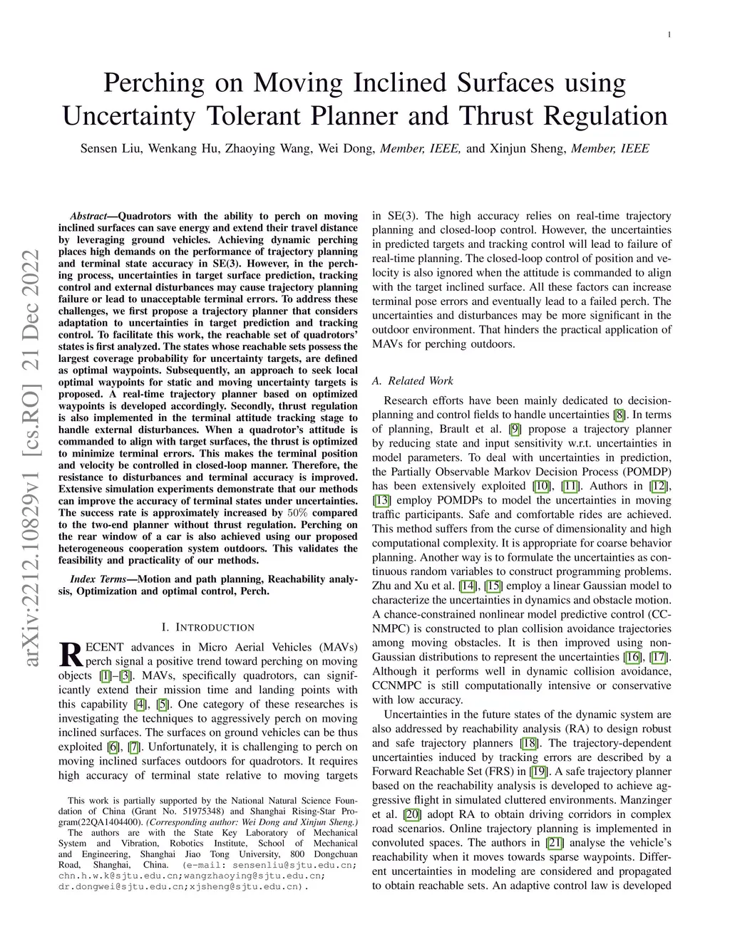 Quadrotors with the ability to perch on moving inclined surfaces can save energy and extend their travel distance by leveraging ground vehicles. Achieving dynamic perching places high demands on the performance of trajectory planning and terminal state accuracy in SE(3). However, in the perching process, uncertainties in target surface prediction, tracking control and external disturbances may cause trajectory planning failure or lead to unacceptable terminal errors. To address these challenges, we first propose a trajectory planner that considers adaptation to uncertainties in target prediction and tracking control. To facilitate this work, the reachable set of quadrotors' states is first analyzed. The states whose reachable sets possess the largest coverage probability for uncertainty targets, are defined as optimal waypoints. Subsequently, an approach to seek local optimal waypoints for static and moving uncertainty targets is proposed. A real-time trajectory planner based on optimized waypoints is developed accordingly. Secondly, thrust regulation is also implemented in the terminal attitude tracking stage to handle external disturbances. When a quadrotor's attitude is commanded to align with target surfaces, the thrust is optimized to minimize terminal errors. This makes the terminal position and velocity be controlled in closed-loop manner. Therefore, the resistance to disturbances and terminal accuracy is improved. Extensive simulation experiments demonstrate that our methods can improve the accuracy of terminal states under uncertainties. The success rate is approximately increased by compared to the two-end planner without thrust regulation. Perching on the rear window of a car is also achieved using our proposed heterogeneous cooperation system outdoors. This validates the feasibility and practicality of our methods.