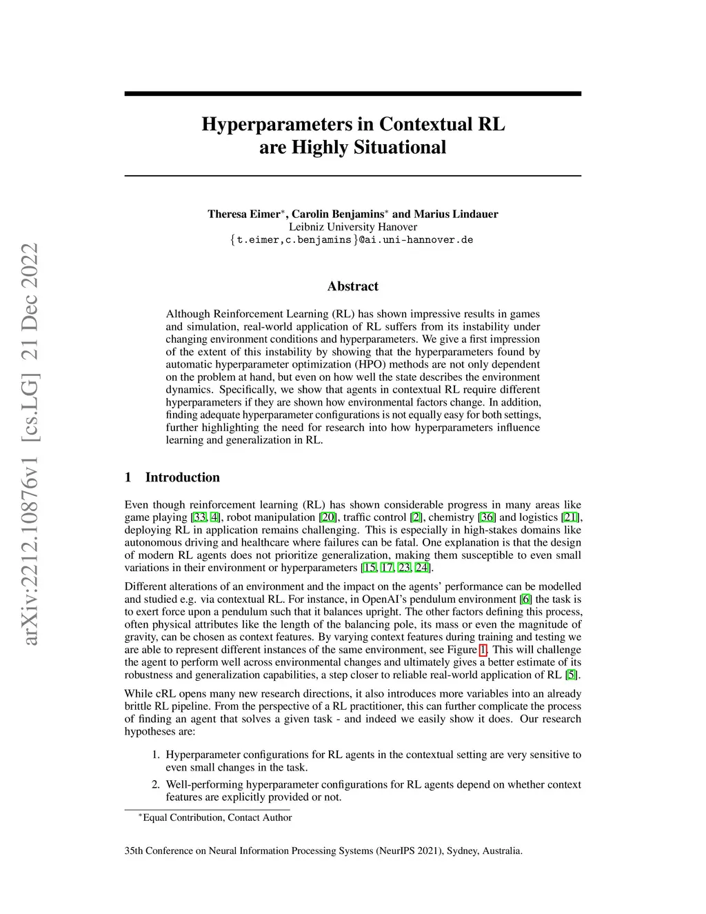 Although Reinforcement Learning (RL) has shown impressive results in games and simulation, real-world application of RL suffers from its instability under changing environment conditions and hyperparameters. We give a first impression of the extent of this instability by showing that the hyperparameters found by automatic hyperparameter optimization (HPO) methods are not only dependent on the problem at hand, but even on how well the state describes the environment dynamics. Specifically, we show that agents in contextual RL require different hyperparameters if they are shown how environmental factors change. In addition, finding adequate hyperparameter configurations is not equally easy for both settings, further highlighting the need for research into how hyperparameters influence learning and generalization in RL.