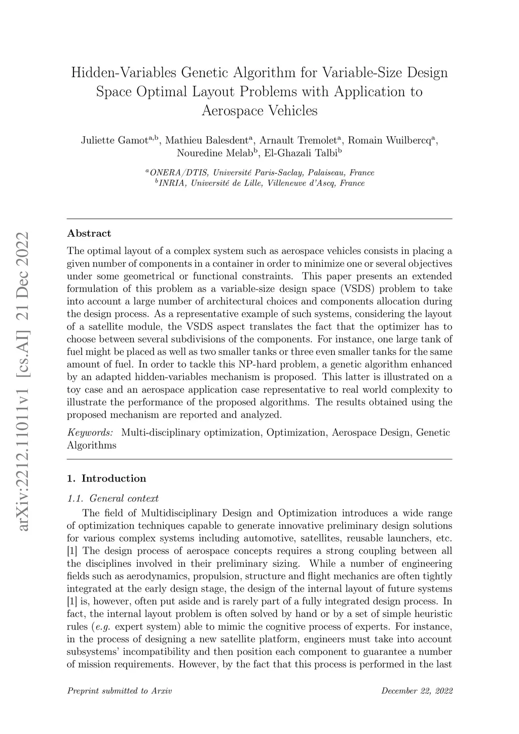 The optimal layout of a complex system such as aerospace vehicles consists in placing a given number of components in a container in order to minimize one or several objectives under some geometrical or functional constraints. This paper presents an extended formulation of this problem as a variable-size design space (VSDS) problem to take into account a large number of architectural choices and components allocation during the design process. As a representative example of such systems, considering the layout of a satellite module, the VSDS aspect translates the fact that the optimizer has to choose between several subdivisions of the components. For instance, one large tank of fuel might be placed as well as two smaller tanks or three even smaller tanks for the same amount of fuel. In order to tackle this NP-hard problem, a genetic algorithm enhanced by an adapted hidden-variables mechanism is proposed. This latter is illustrated on a toy case and an aerospace application case representative to real world complexity to illustrate the performance of the proposed algorithms. The results obtained using the proposed mechanism are reported and analyzed.