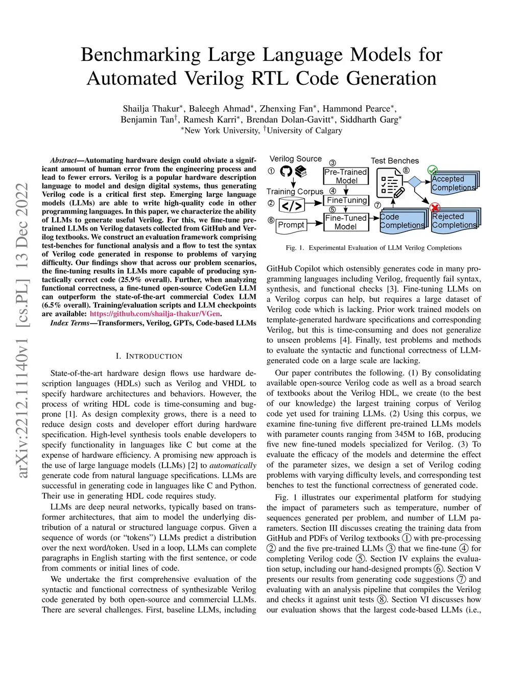 Automating hardware design could obviate a significant amount of human error from the engineering process and lead to fewer errors. Verilog is a popular hardware description language to model and design digital systems, thus generating Verilog code is a critical first step. Emerging large language models (LLMs) are able to write high-quality code in other programming languages. In this paper, we characterize the ability of LLMs to generate useful Verilog. For this, we fine-tune pre-trained LLMs on Verilog datasets collected from GitHub and Verilog textbooks. We construct an evaluation framework comprising test-benches for functional analysis and a flow to test the syntax of Verilog code generated in response to problems of varying difficulty. Our findings show that across our problem scenarios, the fine-tuning results in LLMs more capable of producing syntactically correct code (25.9% overall). Further, when analyzing functional correctness, a fine-tuned open-source CodeGen LLM can outperform the state-of-the-art commercial Codex LLM (6.5% overall). Training/evaluation scripts and LLM checkpoints are available: https://github.com/shailja-thakur/VGen.