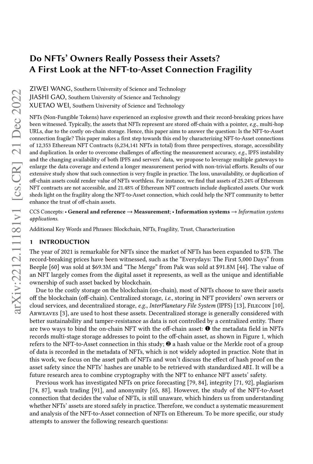 NFTs (Non-Fungible Tokens) have experienced an explosive growth and their record-breaking prices have been witnessed. Typically, the assets that NFTs represent are stored off-chain with a pointer, e.g., multi-hop URLs, due to the costly on-chain storage. Hence, this paper aims to answer the question: Is the NFT-to-Asset connection fragile? This paper makes a first step towards this end by characterizing NFT-to-Asset connections of 12,353 Ethereum NFT Contracts (6,234,141 NFTs in total) from three perspectives, storage, accessibility and duplication. In order to overcome challenges of affecting the measurement accuracy, e.g., IPFS instability and the changing availability of both IPFS and servers' data, we propose to leverage multiple gateways to enlarge the data coverage and extend a longer measurement period with non-trivial efforts. Results of our extensive study show that such connection is very fragile in practice. The loss, unavailability, or duplication of off-chain assets could render value of NFTs worthless. For instance, we find that assets of 25.24% of Ethereum NFT contracts are not accessible, and 21.48% of Ethereum NFT contracts include duplicated assets. Our work sheds light on the fragility along the NFT-to-Asset connection, which could help the NFT community to better enhance the trust of off-chain assets.