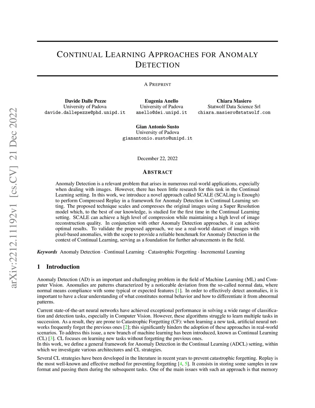 Anomaly Detection is a relevant problem that arises in numerous real-world applications, especially when dealing with images. However, there has been little research for this task in the Continual Learning setting. In this work, we introduce a novel approach called SCALE (SCALing is Enough) to perform Compressed Replay in a framework for Anomaly Detection in Continual Learning setting. The proposed technique scales and compresses the original images using a Super Resolution model which, to the best of our knowledge, is studied for the first time in the Continual Learning setting. SCALE can achieve a high level of compression while maintaining a high level of image reconstruction quality. In conjunction with other Anomaly Detection approaches, it can achieve optimal results. To validate the proposed approach, we use a real-world dataset of images with pixel-based anomalies, with the scope to provide a reliable benchmark for Anomaly Detection in the context of Continual Learning, serving as a foundation for further advancements in the field.