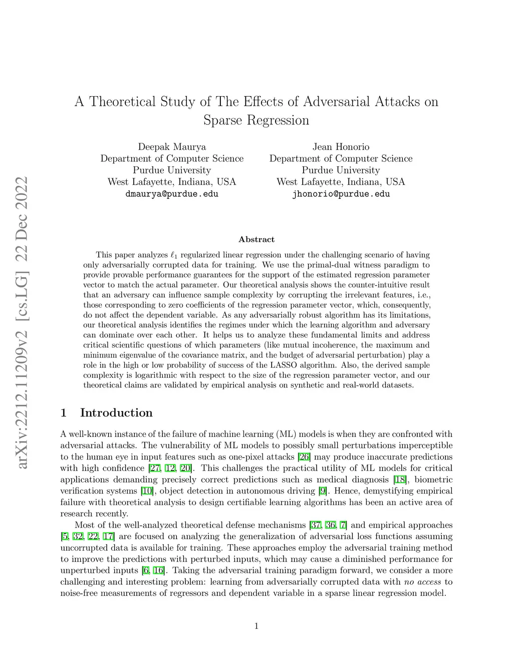 This paper analyzes regularized linear regression under the challenging scenario of having only adversarially corrupted data for training. We use the primal-dual witness paradigm to provide provable performance guarantees for the support of the estimated regression parameter vector to match the actual parameter. Our theoretical analysis shows the counter-intuitive result that an adversary can influence sample complexity by corrupting the irrelevant features, i.e., those corresponding to zero coefficients of the regression parameter vector, which, consequently, do not affect the dependent variable. As any adversarially robust algorithm has its limitations, our theoretical analysis identifies the regimes under which the learning algorithm and adversary can dominate over each other. It helps us to analyze these fundamental limits and address critical scientific questions of which parameters (like mutual incoherence, the maximum and minimum eigenvalue of the covariance matrix, and the budget of adversarial perturbation) play a role in the high or low probability of success of the LASSO algorithm. Also, the derived sample complexity is logarithmic with respect to the size of the regression parameter vector, and our theoretical claims are validated by empirical analysis on synthetic and real-world datasets.