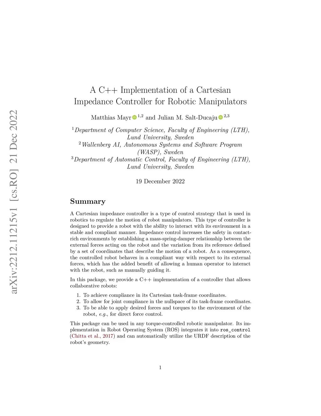 A C++ Implementation of a Cartesian Impedance Controller for Robotic