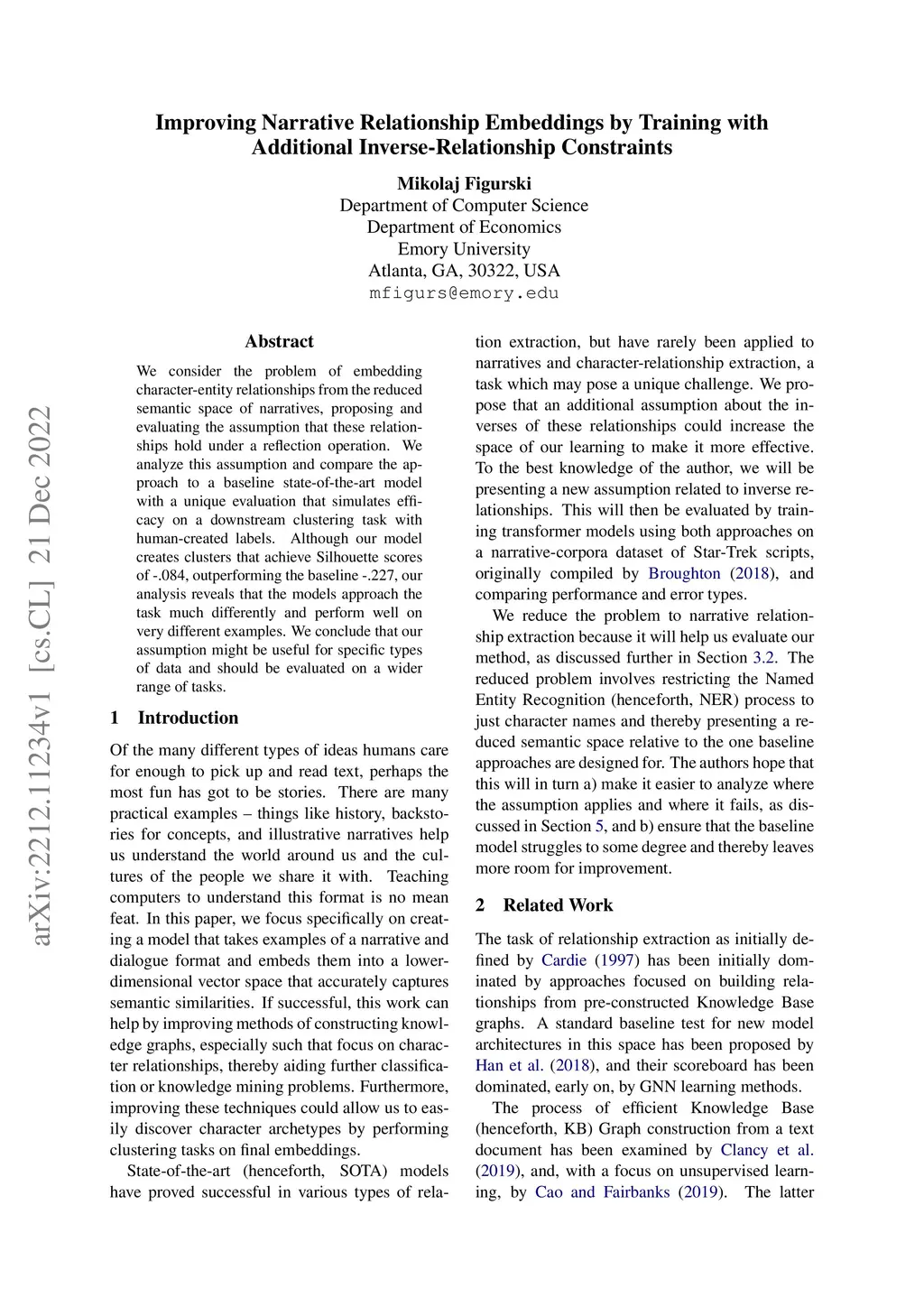 We consider the problem of embedding character-entity relationships from the reduced semantic space of narratives, proposing and evaluating the assumption that these relationships hold under a reflection operation. We analyze this assumption and compare the approach to a baseline state-of-the-art model with a unique evaluation that simulates efficacy on a downstream clustering task with human-created labels. Although our model creates clusters that achieve Silhouette scores of -.084, outperforming the baseline -.227, our analysis reveals that the models approach the task much differently and perform well on very different examples. We conclude that our assumption might be useful for specific types of data and should be evaluated on a wider range of tasks.