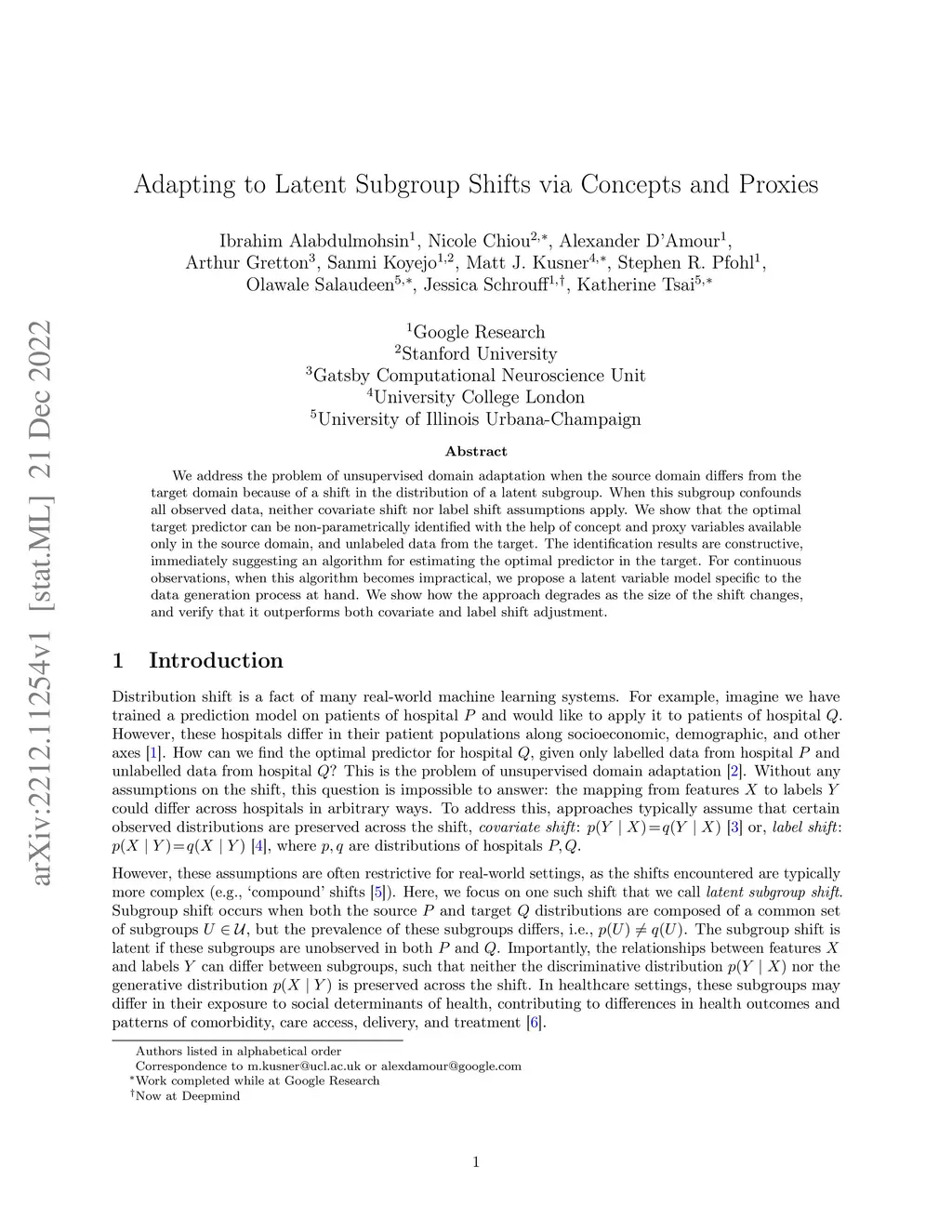 We address the problem of unsupervised domain adaptation when the source domain differs from the target domain because of a shift in the distribution of a latent subgroup. When this subgroup confounds all observed data, neither covariate shift nor label shift assumptions apply. We show that the optimal target predictor can be non-parametrically identified with the help of concept and proxy variables available only in the source domain, and unlabeled data from the target. The identification results are constructive, immediately suggesting an algorithm for estimating the optimal predictor in the target. For continuous observations, when this algorithm becomes impractical, we propose a latent variable model specific to the data generation process at hand. We show how the approach degrades as the size of the shift changes, and verify that it outperforms both covariate and label shift adjustment.