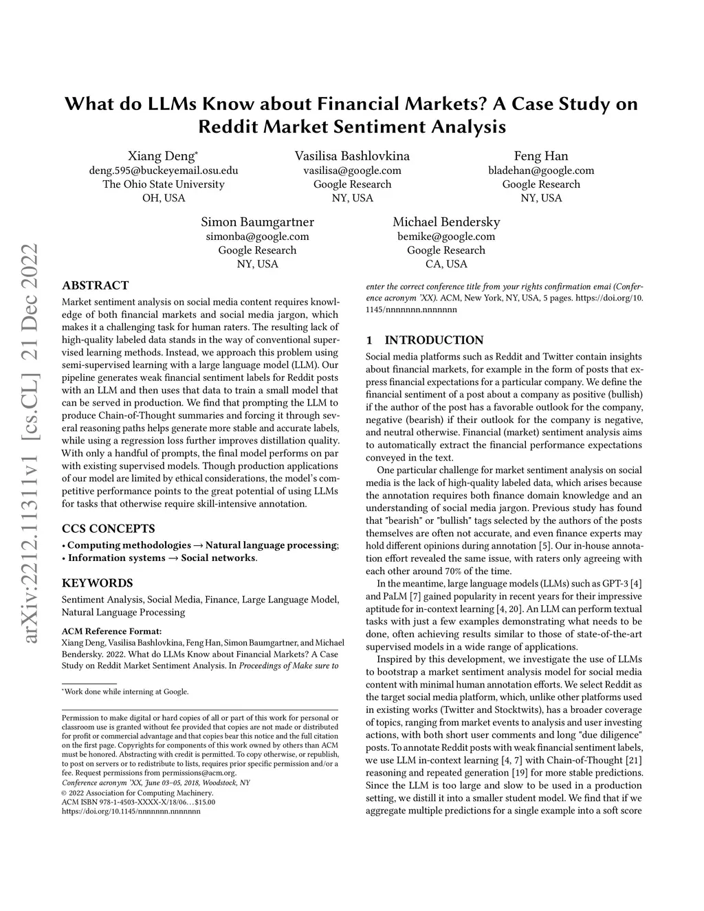 Market sentiment analysis on social media content requires knowledge of both financial markets and social media jargon, which makes it a challenging task for human raters. The resulting lack of high-quality labeled data stands in the way of conventional supervised learning methods. Instead, we approach this problem using semi-supervised learning with a large language model (LLM). Our pipeline generates weak financial sentiment labels for Reddit posts with an LLM and then uses that data to train a small model that can be served in production. We find that prompting the LLM to produce Chain-of-Thought summaries and forcing it through several reasoning paths helps generate more stable and accurate labels, while using a regression loss further improves distillation quality. With only a handful of prompts, the final model performs on par with existing supervised models. Though production applications of our model are limited by ethical considerations, the model's competitive performance points to the great potential of using LLMs for tasks that otherwise require skill-intensive annotation.