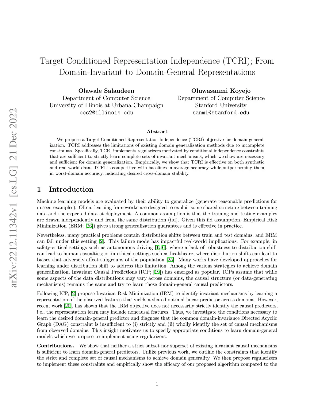 We propose a Target Conditioned Representation Independence (TCRI) objective for domain generalization. TCRI addresses the limitations of existing domain generalization methods due to incomplete constraints. Specifically, TCRI implements regularizers motivated by conditional independence constraints that are sufficient to strictly learn complete sets of invariant mechanisms, which we show are necessary and sufficient for domain generalization. Empirically, we show that TCRI is effective on both synthetic and real-world data. TCRI is competitive with baselines in average accuracy while outperforming them in worst-domain accuracy, indicating desired cross-domain stability.