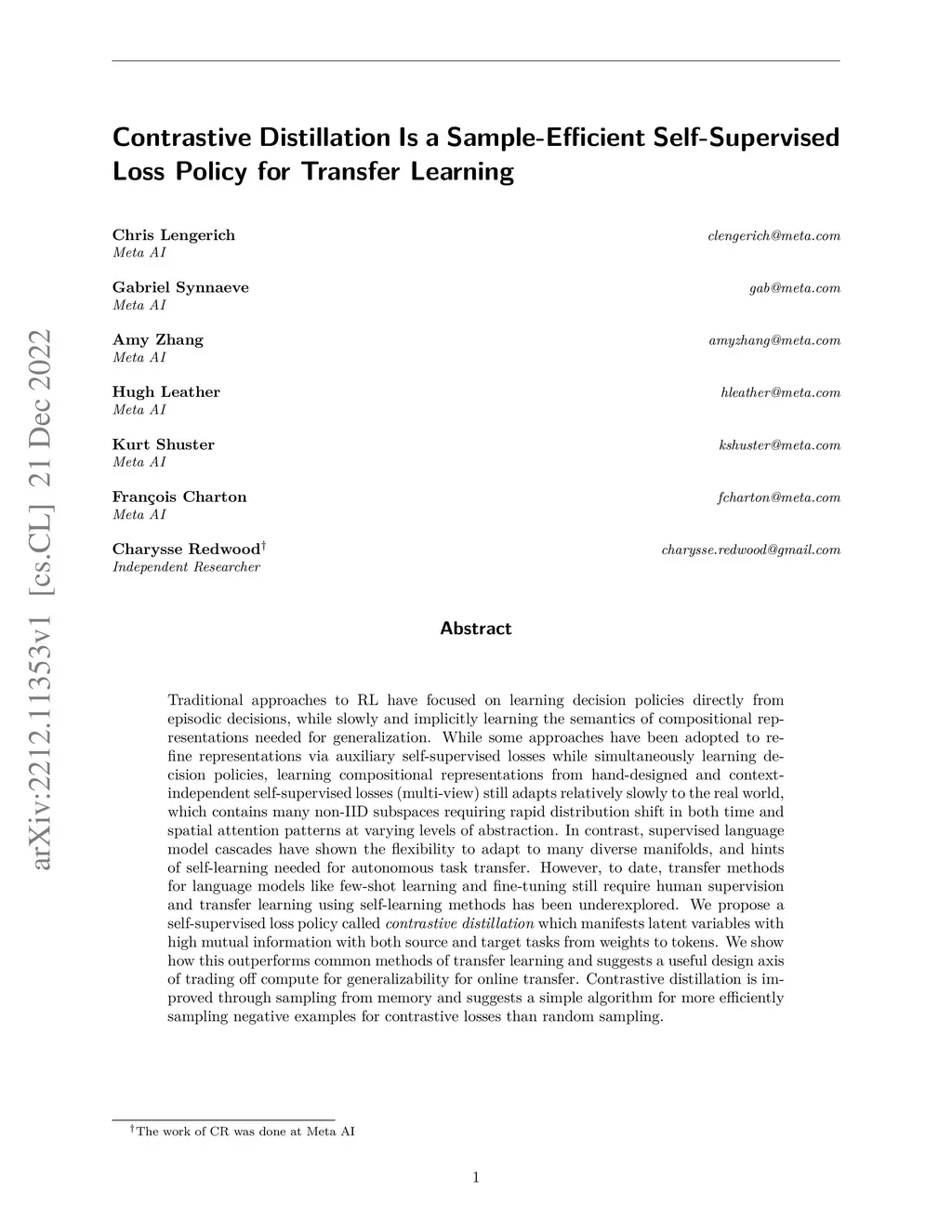 Traditional approaches to RL have focused on learning decision policies directly from episodic decisions, while slowly and implicitly learning the semantics of compositional representations needed for generalization. While some approaches have been adopted to refine representations via auxiliary self-supervised losses while simultaneously learning decision policies, learning compositional representations from hand-designed and context-independent self-supervised losses (multi-view) still adapts relatively slowly to the real world, which contains many non-IID subspaces requiring rapid distribution shift in both time and spatial attention patterns at varying levels of abstraction. In contrast, supervised language model cascades have shown the flexibility to adapt to many diverse manifolds, and hints of self-learning needed for autonomous task transfer. However, to date, transfer methods for language models like few-shot learning and fine-tuning still require human supervision and transfer learning using self-learning methods has been underexplored. We propose a self-supervised loss policy called contrastive distillation which manifests latent variables with high mutual information with both source and target tasks from weights to tokens. We show how this outperforms common methods of transfer learning and suggests a useful design axis of trading off compute for generalizability for online transfer. Contrastive distillation is improved through sampling from memory and suggests a simple algorithm for more efficiently sampling negative examples for contrastive losses than random sampling.