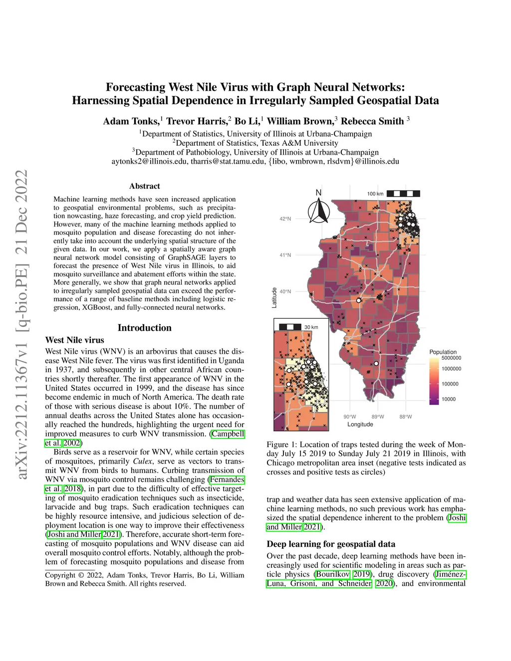 Machine learning methods have seen increased application to geospatial environmental problems, such as precipitation nowcasting, haze forecasting, and crop yield prediction. However, many of the machine learning methods applied to mosquito population and disease forecasting do not inherently take into account the underlying spatial structure of the given data. In our work, we apply a spatially aware graph neural network model consisting of GraphSAGE layers to forecast the presence of West Nile virus in Illinois, to aid mosquito surveillance and abatement efforts within the state. More generally, we show that graph neural networks applied to irregularly sampled geospatial data can exceed the performance of a range of baseline methods including logistic regression, XGBoost, and fully-connected neural networks.