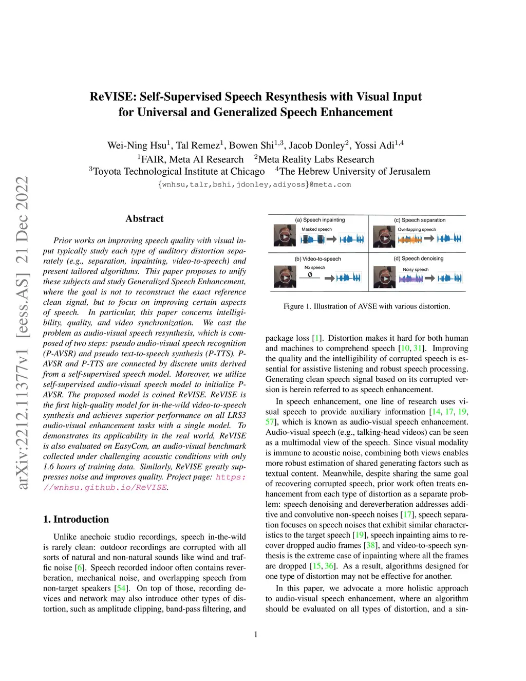 Prior works on improving speech quality with visual input typically study each type of auditory distortion separately (e.g., separation, inpainting, video-to-speech) and present tailored algorithms. This paper proposes to unify these subjects and study Generalized Speech Enhancement, where the goal is not to reconstruct the exact reference clean signal, but to focus on improving certain aspects of speech. In particular, this paper concerns intelligibility, quality, and video synchronization. We cast the problem as audio-visual speech resynthesis, which is composed of two steps: pseudo audio-visual speech recognition (P-AVSR) and pseudo text-to-speech synthesis (P-TTS). P-AVSR and P-TTS are connected by discrete units derived from a self-supervised speech model. Moreover, we utilize self-supervised audio-visual speech model to initialize P-AVSR. The proposed model is coined ReVISE. ReVISE is the first high-quality model for in-the-wild video-to-speech synthesis and achieves superior performance on all LRS3 audio-visual enhancement tasks with a single model. To demonstrates its applicability in the real world, ReVISE is also evaluated on EasyCom, an audio-visual benchmark collected under challenging acoustic conditions with only 1.6 hours of training data. Similarly, ReVISE greatly suppresses noise and improves quality. Project page: https://wnhsu.github.io/ReVISE.