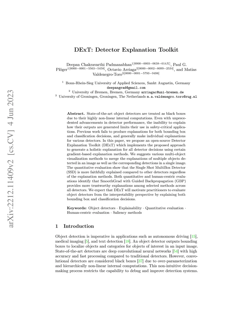 State-of-the-art object detectors are treated as black boxes due to their highly non-linear internal computations. Even with unprecedented advancements in detector performance, the inability to explain how their outputs are generated limits their use in safety-critical applications. Previous work fails to produce explanations for both bounding box and classification decisions, and generally make individual explanations for various detectors. In this paper, we propose an open-source Detector Explanation Toolkit (DExT) which implements the proposed approach to generate a holistic explanation for all detector decisions using certain gradient-based explanation methods. We suggests various multi-object visualization methods to merge the explanations of multiple objects detected in an image as well as the corresponding detections in a single image. The quantitative evaluation show that the Single Shot MultiBox Detector (SSD) is more faithfully explained compared to other detectors regardless of the explanation methods. Both quantitative and human-centric evaluations identify that SmoothGrad with Guided Backpropagation (GBP) provides more trustworthy explanations among selected methods across all detectors. We expect that DExT will motivate practitioners to evaluate object detectors from the interpretability perspective by explaining both bounding box and classification decisions.