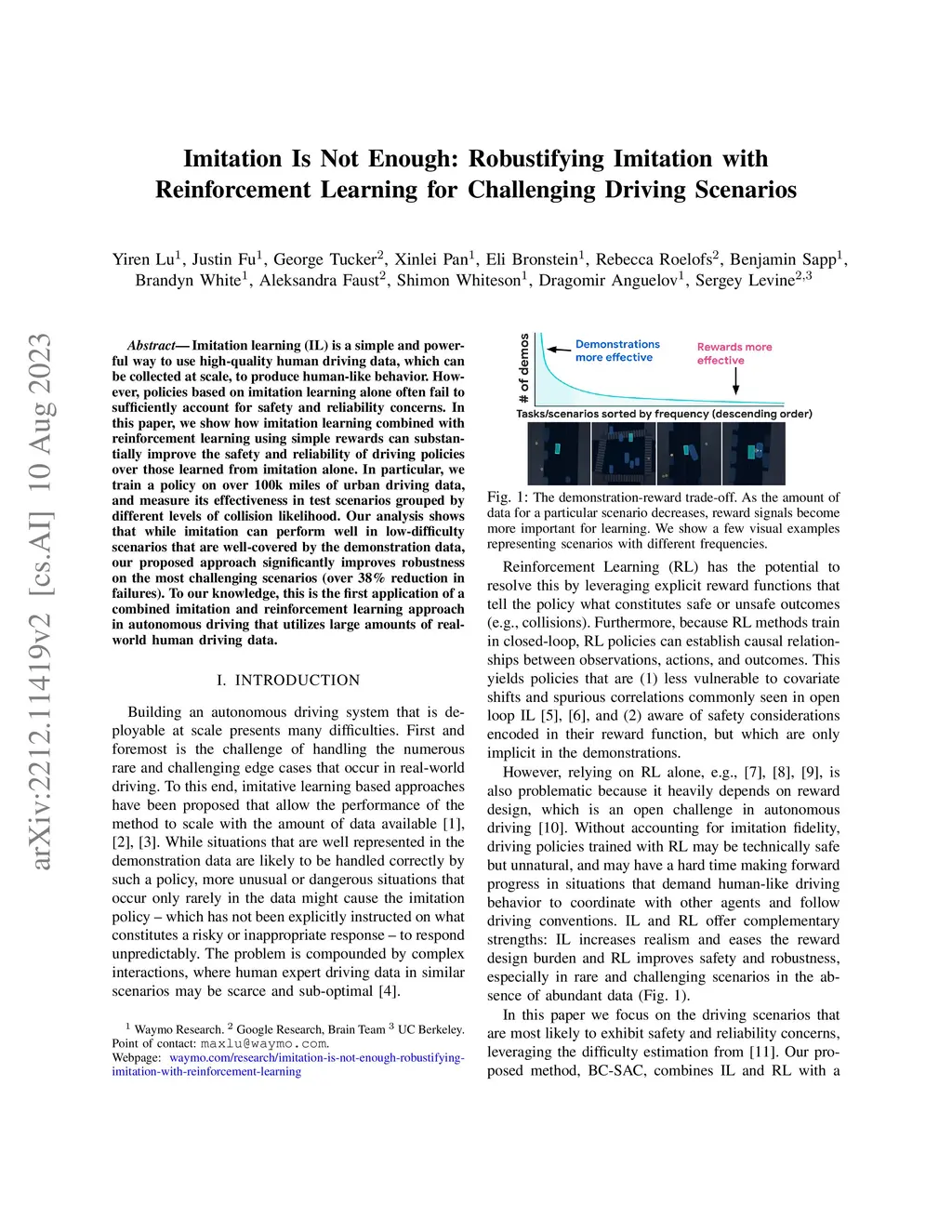 Imitation learning (IL) is a simple and powerful way to use high-quality human driving data, which can be collected at scale, to produce human-like behavior. However, policies based on imitation learning alone often fail to sufficiently account for safety and reliability concerns. In this paper, we show how imitation learning combined with reinforcement learning using simple rewards can substantially improve the safety and reliability of driving policies over those learned from imitation alone. In particular, we train a policy on over 100k miles of urban driving data, and measure its effectiveness in test scenarios grouped by different levels of collision likelihood. Our analysis shows that while imitation can perform well in low-difficulty scenarios that are well-covered by the demonstration data, our proposed approach significantly improves robustness on the most challenging scenarios (over 38% reduction in failures). To our knowledge, this is the first application of a combined imitation and reinforcement learning approach in autonomous driving that utilizes large amounts of real-world human driving data.