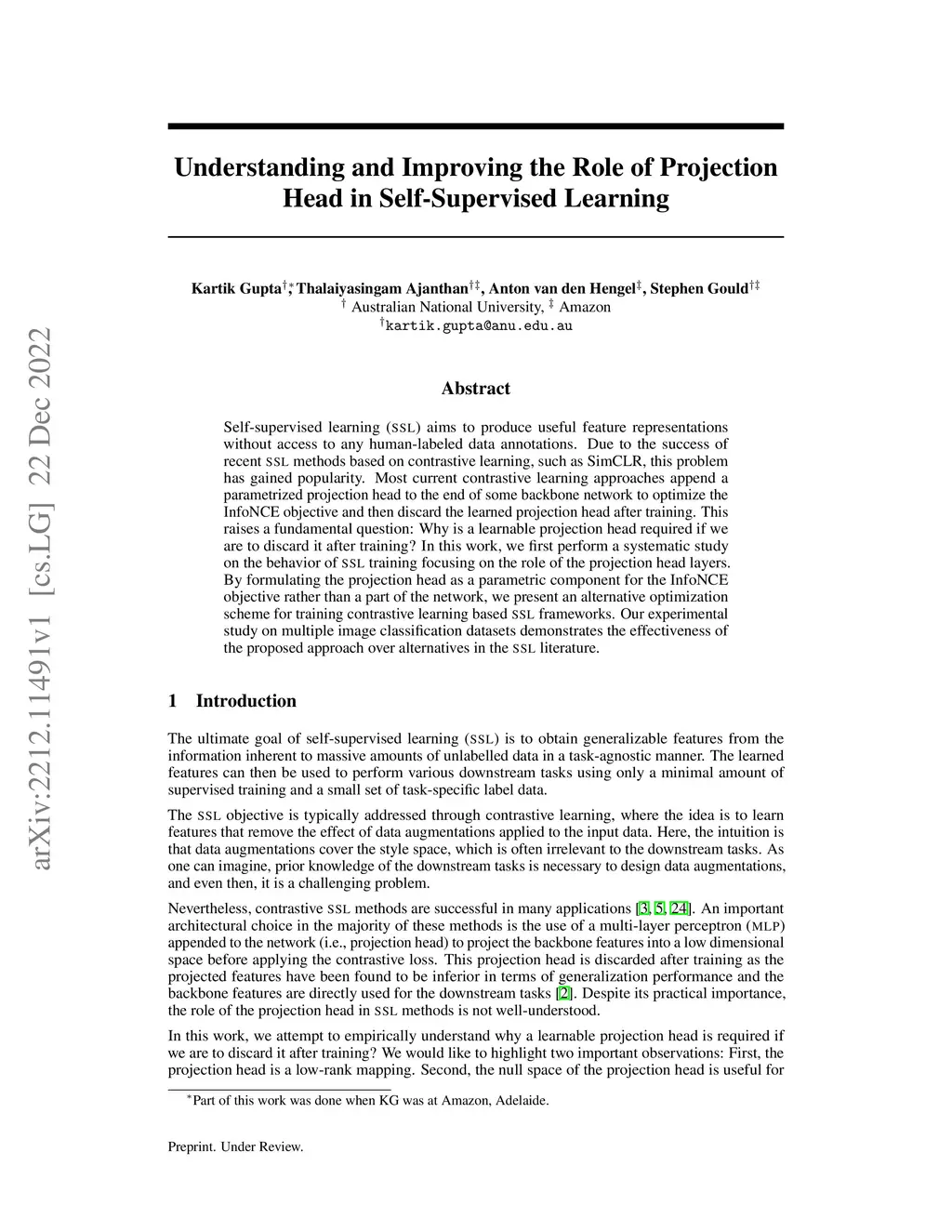 Self-supervised learning (SSL) aims to produce useful feature representations without access to any human-labeled data annotations. Due to the success of recent SSL methods based on contrastive learning, such as SimCLR, this problem has gained popularity. Most current contrastive learning approaches append a parametrized projection head to the end of some backbone network to optimize the InfoNCE objective and then discard the learned projection head after training. This raises a fundamental question: Why is a learnable projection head required if we are to discard it after training? In this work, we first perform a systematic study on the behavior of SSL training focusing on the role of the projection head layers. By formulating the projection head as a parametric component for the InfoNCE objective rather than a part of the network, we present an alternative optimization scheme for training contrastive learning based SSL frameworks. Our experimental study on multiple image classification datasets demonstrates the effectiveness of the proposed approach over alternatives in the SSL literature.