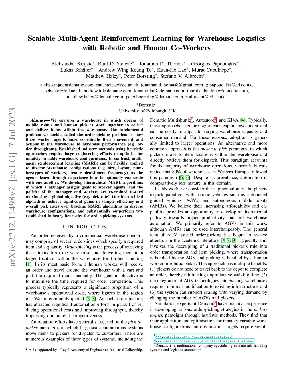 We envision a warehouse in which dozens of mobile robots and human pickers work together to collect and deliver items within the warehouse. The fundamental problem we tackle, called the order-picking problem, is how these worker agents must coordinate their movement and actions in the warehouse to maximise performance (e.g. order throughput). Established industry methods using heuristic approaches require large engineering efforts to optimise for innately variable warehouse configurations. In contrast, multi-agent reinforcement learning (MARL) can be flexibly applied to diverse warehouse configurations (e.g. size, layout, number/types of workers, item replenishment frequency), as the agents learn through experience how to optimally cooperate with one another. We develop hierarchical MARL algorithms in which a manager assigns goals to worker agents, and the policies of the manager and workers are co-trained toward maximising a global objective (e.g. pick rate). Our hierarchical algorithms achieve significant gains in sample efficiency and overall pick rates over baseline MARL algorithms in diverse warehouse configurations, and substantially outperform two established industry heuristics for order-picking systems.