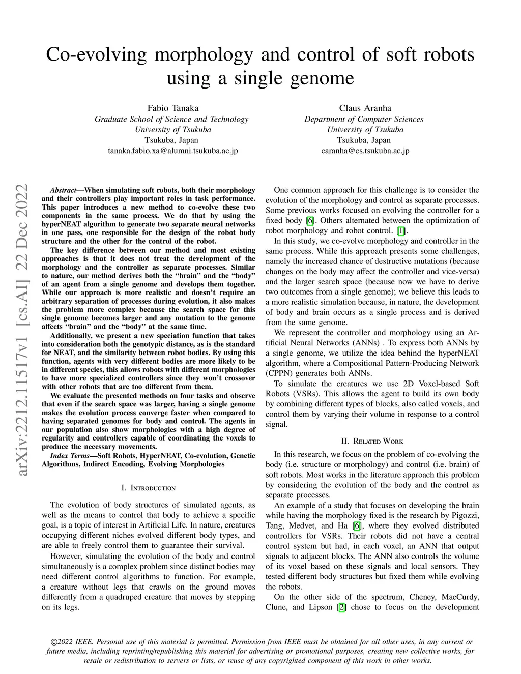 Co-evolving morphology and control of soft robots using a single genome