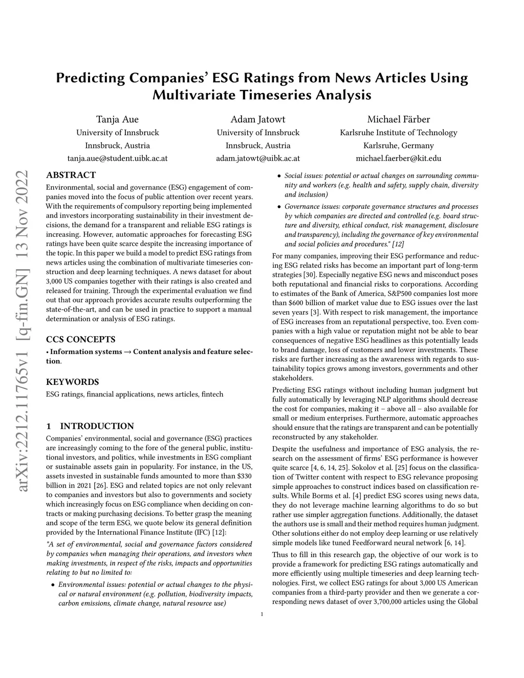 Environmental, social and governance (ESG) engagement of companies moved into the focus of public attention over recent years. With the requirements of compulsory reporting being implemented and investors incorporating sustainability in their investment decisions, the demand for transparent and reliable ESG ratings is increasing. However, automatic approaches for forecasting ESG ratings have been quite scarce despite the increasing importance of the topic. In this paper, we build a model to predict ESG ratings from news articles using the combination of multivariate timeseries construction and deep learning techniques. A news dataset for about 3,000 US companies together with their ratings is also created and released for training. Through the experimental evaluation we find out that our approach provides accurate results outperforming the state-of-the-art, and can be used in practice to support a manual determination or analysis of ESG ratings.