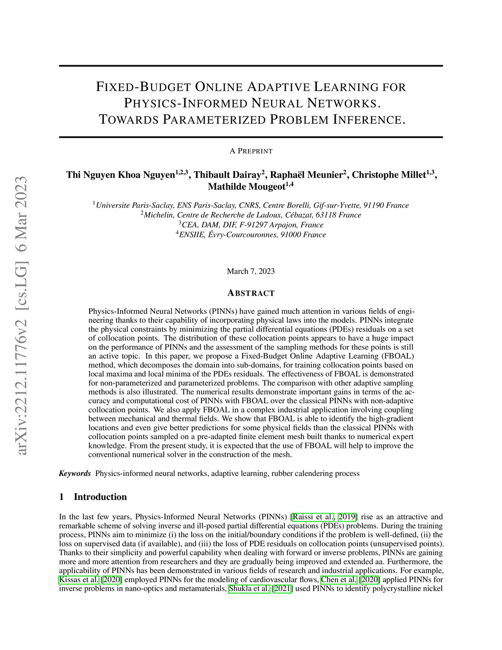Physics-Informed Neural Networks (PINNs) have gained much attention in various fields of engineering thanks to their capability of incorporating physical laws into the models. PINNs integrate the physical constraints by minimizing the partial differential equations (PDEs) residuals on a set of collocation points. The distribution of these collocation points appears to have a huge impact on the performance of PINNs and the assessment of the sampling methods for these points is still an active topic. In this paper, we propose a Fixed-Budget Online Adaptive Learning (FBOAL) method, which decomposes the domain into sub-domains, for training collocation points based on local maxima and local minima of the PDEs residuals. The effectiveness of FBOAL is demonstrated for non-parameterized and parameterized problems. The comparison with other adaptive sampling methods is also illustrated. The numerical results demonstrate important gains in terms of the accuracy and computational cost of PINNs with FBOAL over the classical PINNs with non-adaptive collocation points. We also apply FBOAL in a complex industrial application involving coupling between mechanical and thermal fields. We show that FBOAL is able to identify the high-gradient locations and even give better predictions for some physical fields than the classical PINNs with collocation points sampled on a pre-adapted finite element mesh built thanks to numerical expert knowledge. From the present study, it is expected that the use of FBOAL will help to improve the conventional numerical solver in the construction of the mesh.