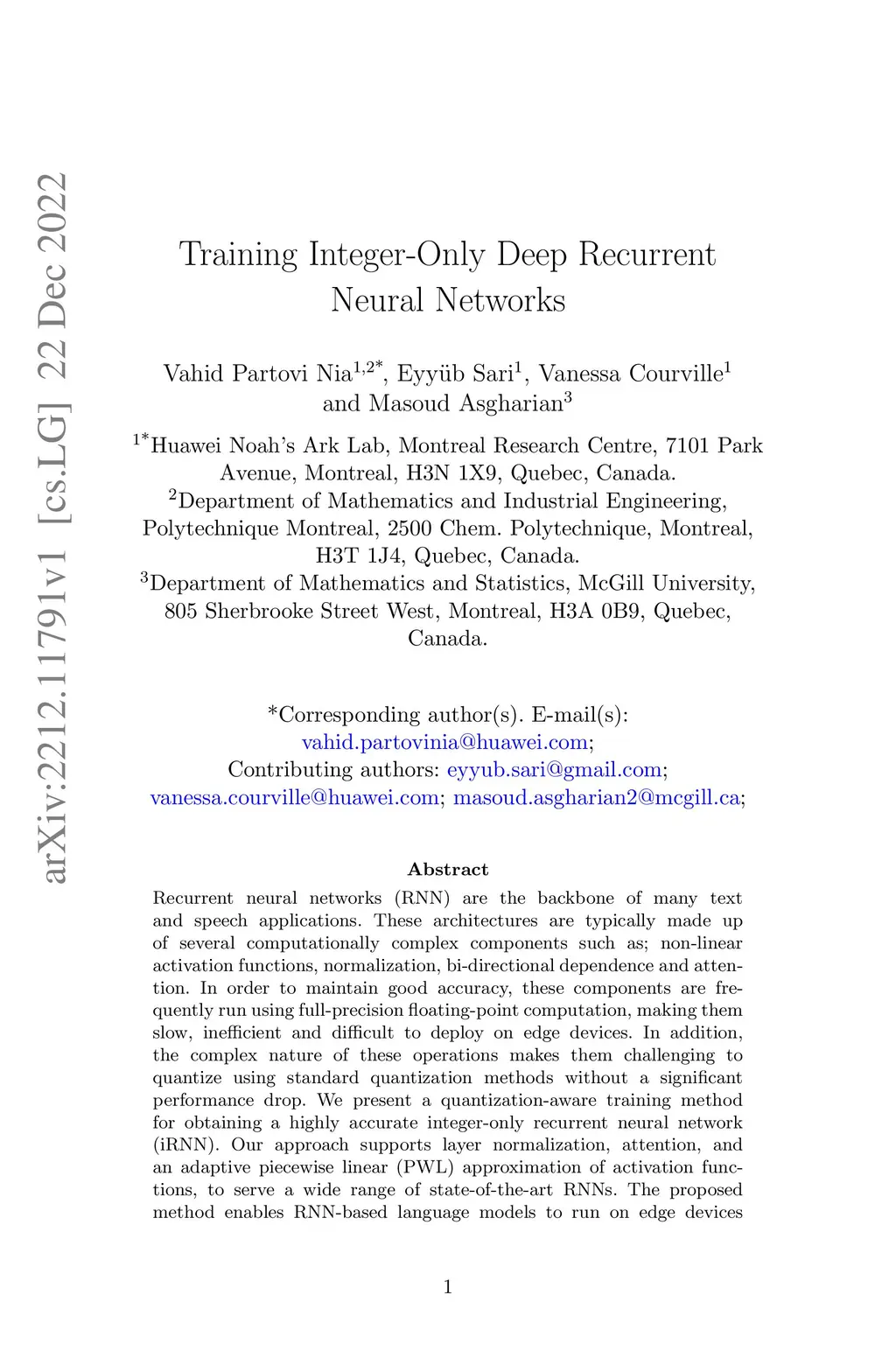 Recurrent neural networks (RNN) are the backbone of many text and speech applications. These architectures are typically made up of several computationally complex components such as; non-linear activation functions, normalization, bi-directional dependence and attention. In order to maintain good accuracy, these components are frequently run using full-precision floating-point computation, making them slow, inefficient and difficult to deploy on edge devices. In addition, the complex nature of these operations makes them challenging to quantize using standard quantization methods without a significant performance drop. We present a quantization-aware training method for obtaining a highly accurate integer-only recurrent neural network (iRNN). Our approach supports layer normalization, attention, and an adaptive piecewise linear (PWL) approximation of activation functions, to serve a wide range of state-of-the-art RNNs. The proposed method enables RNN-based language models to run on edge devices with improvement in runtime, and reduction in model size while maintaining similar accuracy as its full-precision counterpart.
