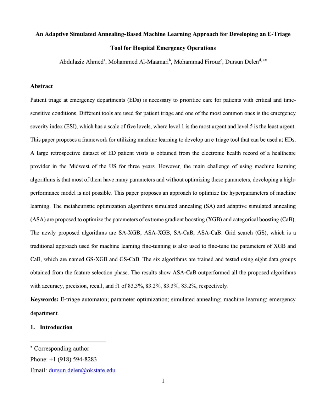 An Adaptive Simulated Annealing-Based Machine Learning Approach for Developing an E-Triage Tool for Hospital Emergency Operations
