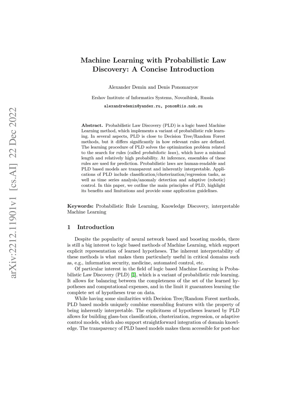 Probabilistic Law Discovery (PLD) is a logic based Machine Learning method, which implements a variant of probabilistic rule learning. In several aspects, PLD is close to Decision Tree/Random Forest methods, but it differs significantly in how relevant rules are defined. The learning procedure of PLD solves the optimization problem related to the search for rules (called probabilistic laws), which have a minimal length and relatively high probability. At inference, ensembles of these rules are used for prediction. Probabilistic laws are human-readable and PLD based models are transparent and inherently interpretable. Applications of PLD include classification/clusterization/regression tasks, as well as time series analysis/anomaly detection and adaptive (robotic) control. In this paper, we outline the main principles of PLD, highlight its benefits and limitations and provide some application guidelines.
