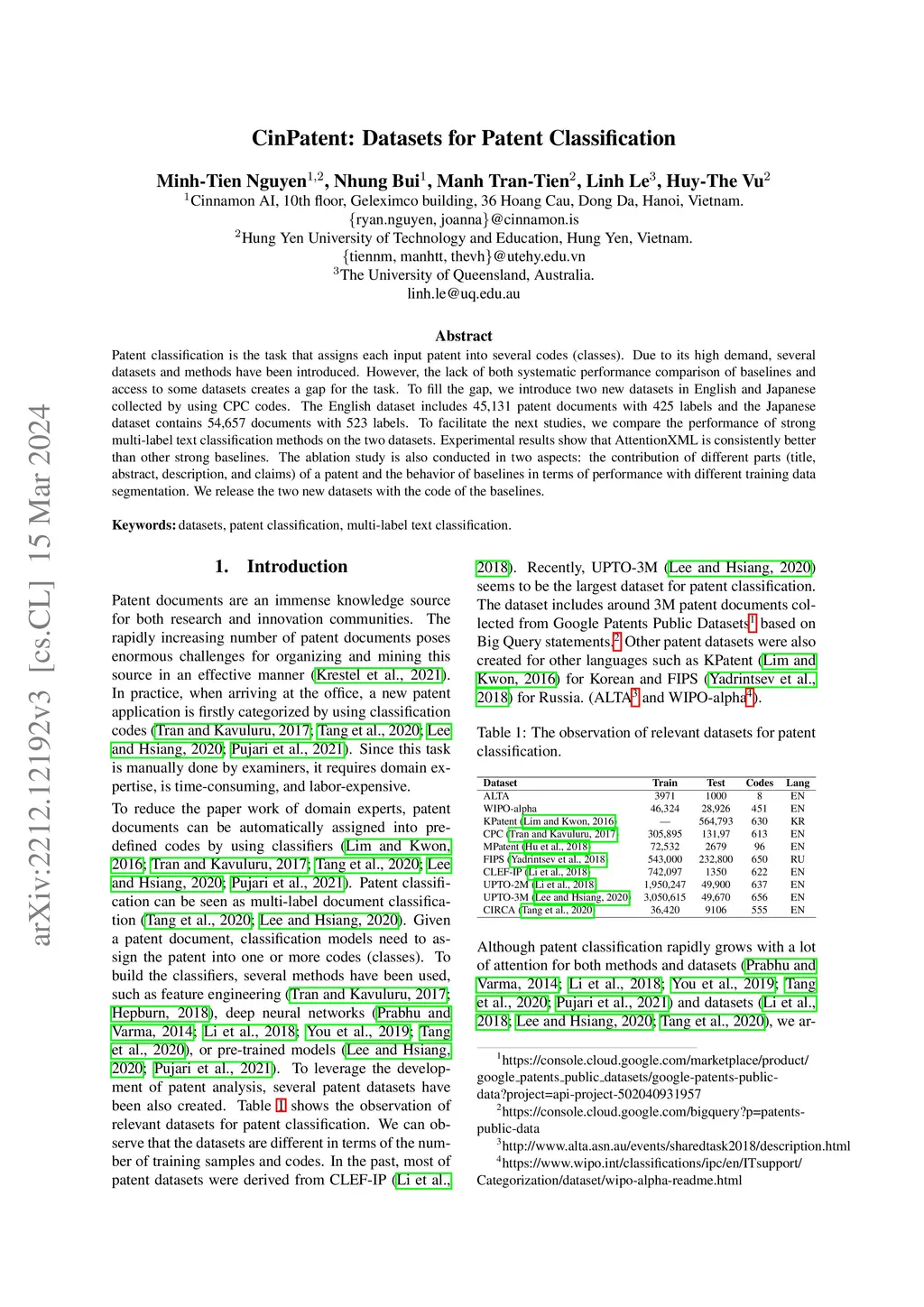 CinPatent: Datasets for Patent Classification