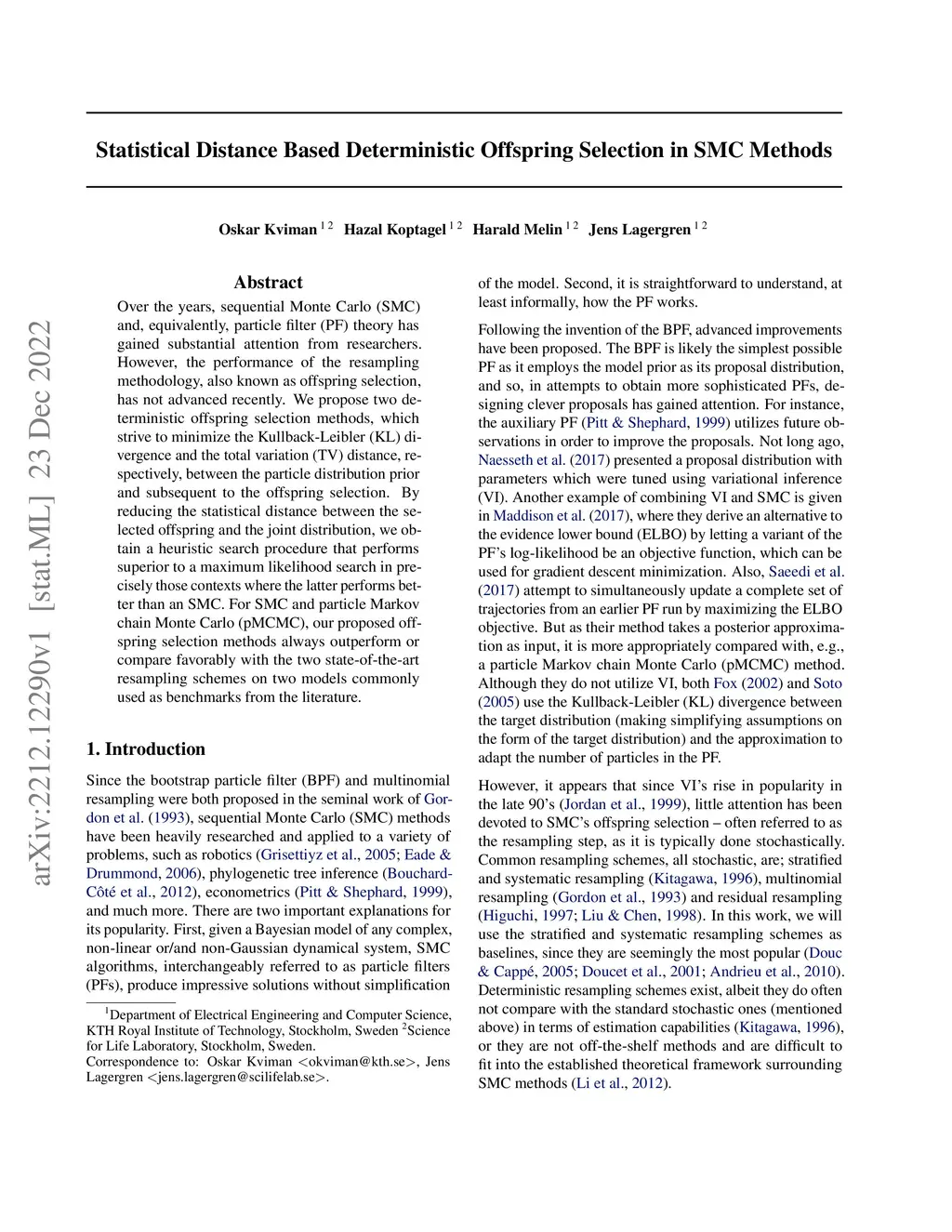 Over the years, sequential Monte Carlo (SMC) and, equivalently, particle filter (PF) theory has gained substantial attention from researchers. However, the performance of the resampling methodology, also known as offspring selection, has not advanced recently. We propose two deterministic offspring selection methods, which strive to minimize the Kullback-Leibler (KL) divergence and the total variation (TV) distance, respectively, between the particle distribution prior and subsequent to the offspring selection. By reducing the statistical distance between the selected offspring and the joint distribution, we obtain a heuristic search procedure that performs superior to a maximum likelihood search in precisely those contexts where the latter performs better than an SMC. For SMC and particle Markov chain Monte Carlo (pMCMC), our proposed offspring selection methods always outperform or compare favorably with the two state-of-the-art resampling schemes on two models commonly used as benchmarks from the literature.
