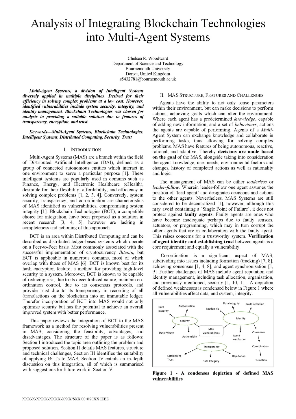 Multi-Agent Systems, a division of Intelligent Systems diversely applied in multiple disciplines. Desired for their efficiency in solving complex problems at a low cost. However, identified vulnerabilities include system security, integrity, and identity management. Blockchain Technologies was chosen for analysis in providing a suitable solution due to features of transparency, encryption, and trust.