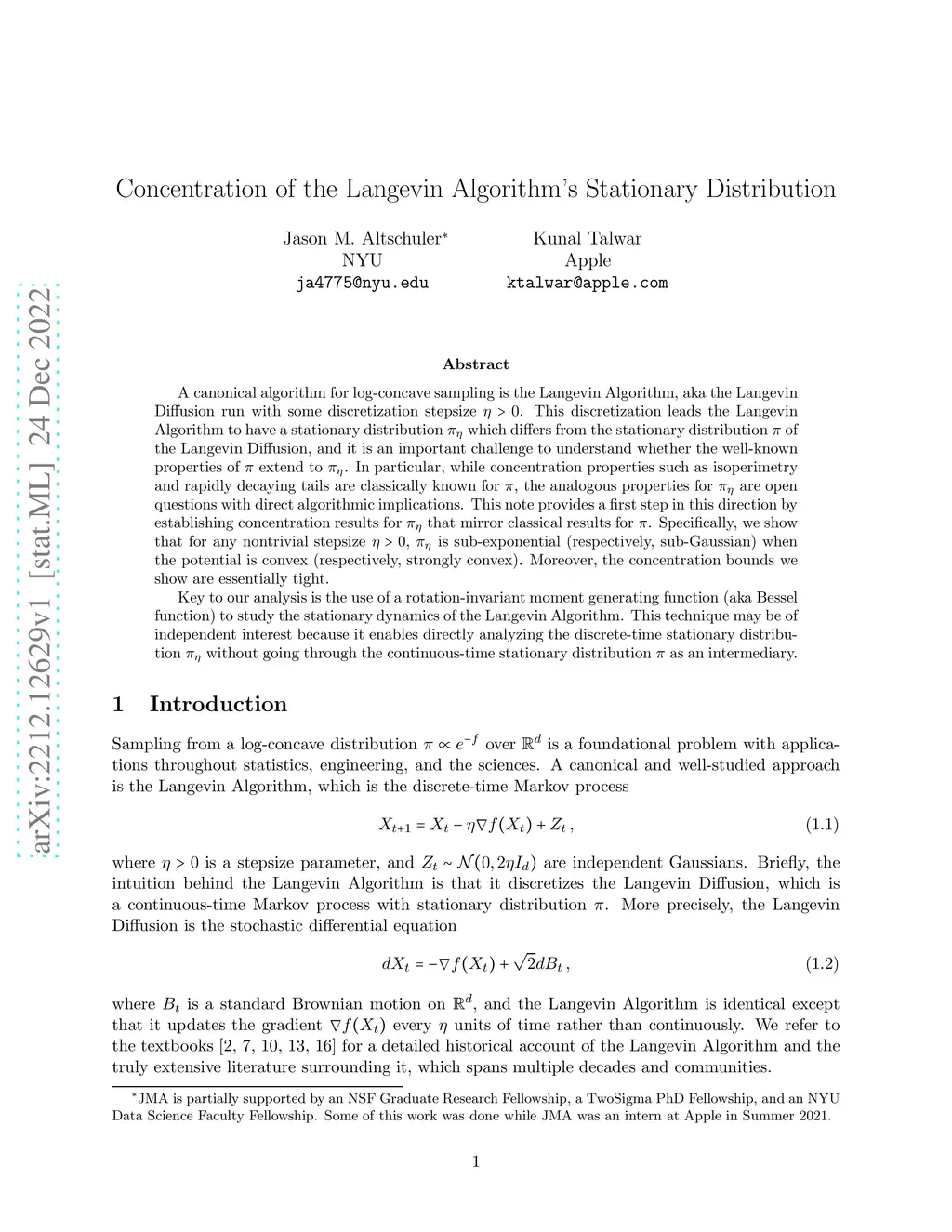 A canonical algorithm for log-concave sampling is the Langevin Algorithm, aka the Langevin Diffusion run with some discretization stepsize . This discretization leads the Langevin Algorithm to have a stationary distribution which differs from the stationary distribution of the Langevin Diffusion, and it is an important challenge to understand whether the well-known properties of extend to . In particular, while concentration properties such as isoperimetry and rapidly decaying tails are classically known for , the analogous properties for are open questions with direct algorithmic implications. This note provides a first step in this direction by establishing concentration results for that mirror classical results for . Specifically, we show that for any nontrivial stepsize , is sub-exponential (respectively, sub-Gaussian) when the potential is convex (respectively, strongly convex). Moreover, the concentration bounds we show are essentially tight. Key to our analysis is the use of a rotation-invariant moment generating function (aka Bessel function) to study the stationary dynamics of the Langevin Algorithm. This technique may be of independent interest because it enables directly analyzing the discrete-time stationary distribution without going through the continuous-time stationary distribution as an intermediary.