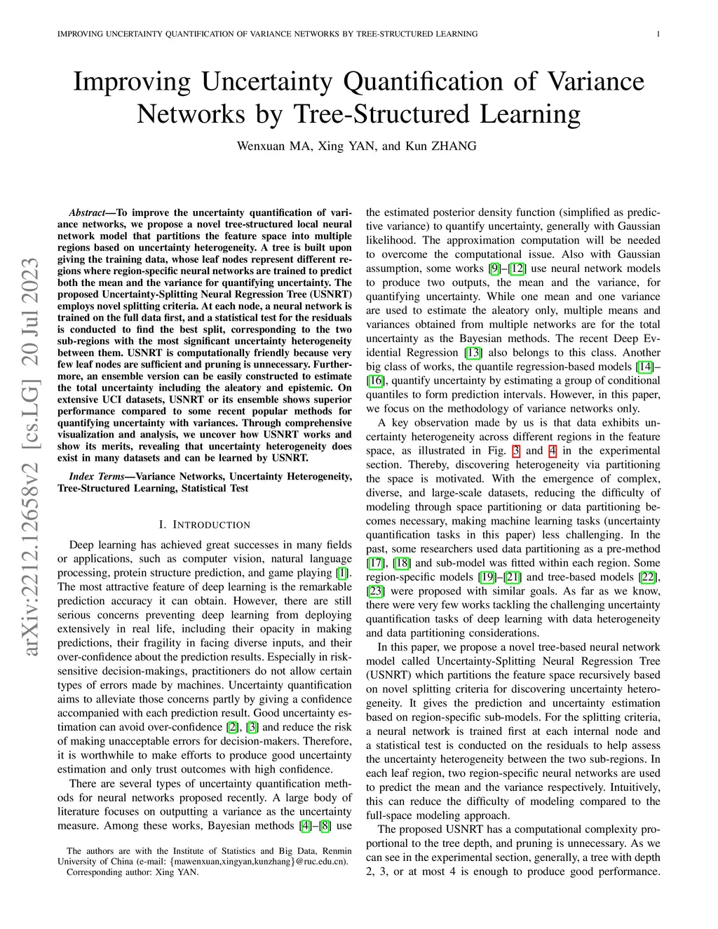 To improve the uncertainty quantification of variance networks, we propose a novel tree-structured local neural network model that partitions the feature space into multiple regions based on uncertainty heterogeneity. A tree is built upon giving the training data, whose leaf nodes represent different regions where region-specific neural networks are trained to predict both the mean and the variance for quantifying uncertainty. The proposed Uncertainty-Splitting Neural Regression Tree (USNRT) employs novel splitting criteria. At each node, a neural network is trained on the full data first, and a statistical test for the residuals is conducted to find the best split, corresponding to the two sub-regions with the most significant uncertainty heterogeneity between them. USNRT is computationally friendly because very few leaf nodes are sufficient and pruning is unnecessary. Furthermore, an ensemble version can be easily constructed to estimate the total uncertainty including the aleatory and epistemic. On extensive UCI datasets, USNRT or its ensemble shows superior performance compared to some recent popular methods for quantifying uncertainty with variances. Through comprehensive visualization and analysis, we uncover how USNRT works and show its merits, revealing that uncertainty heterogeneity does exist in many datasets and can be learned by USNRT.